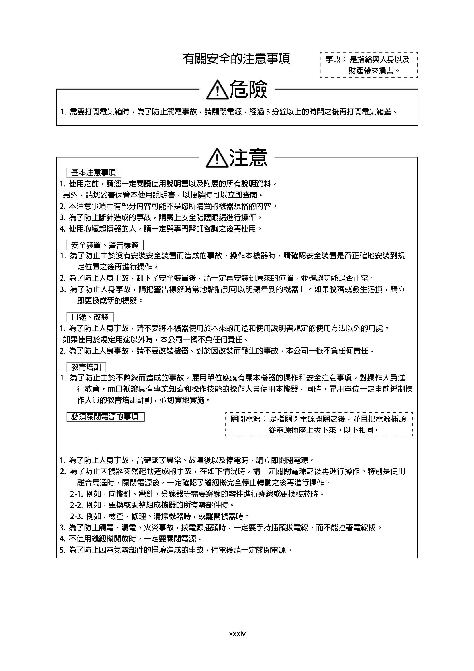 5. 為了防止因電氣零部件的損壞造成的事故,停電後請一定關閉電源。xxxv