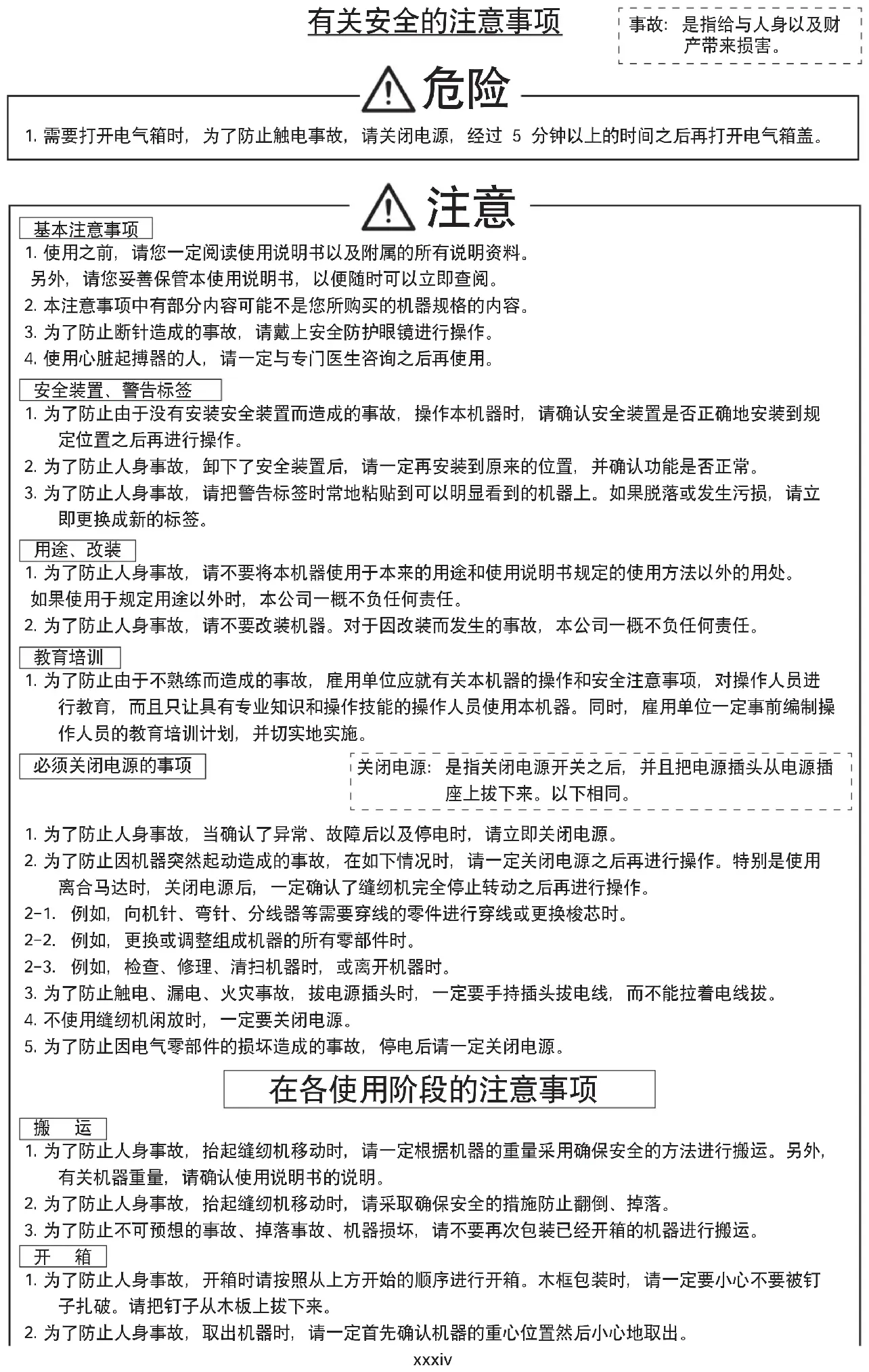 1.为了防止人身事故,开箱时请按照从上方开始的顺序进行开箱。木框包装时,请一定要小心不要被钉 子扎破。请把钉子从木板上拔下来。 2.为了防止人身事故,取出机器时,请一定首先确认机器的重心位置然后小心地取出。xxxv