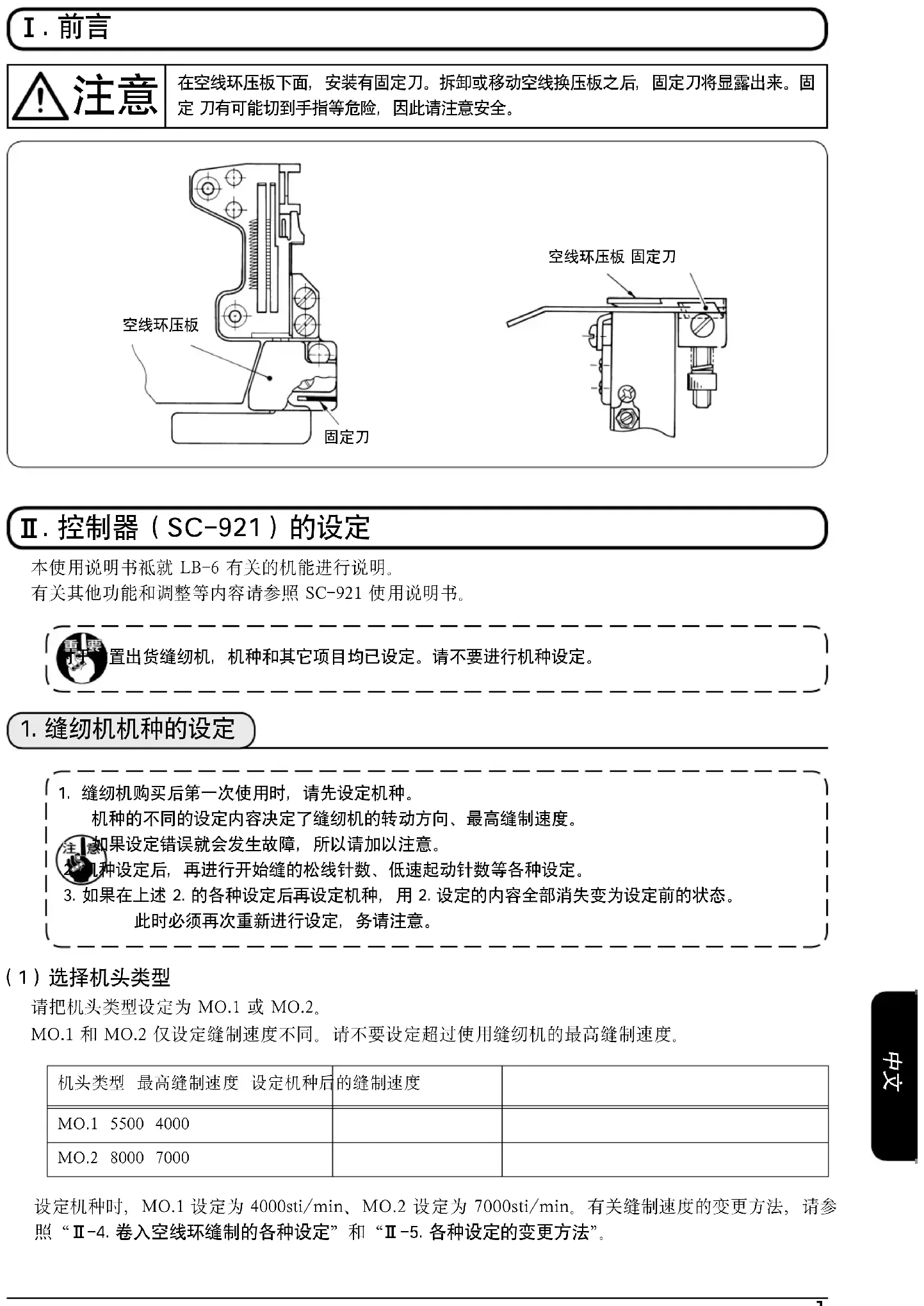 在空线环压板下面,安装有固定刀。拆卸或移动空线换压板之后,固定刀将显露出来。固定 刀有可能切到手指等危险,因此请注意安全。空线环压板 固定刀空线环压板 (1)选择机头类型 请把机头类型设定为 MO.1 或 MO.2。MO.1 和 MO.2 仅设定缝制速度不同。请不要设定超过使用缝纫机的最高缝制速度。 机头类型 最高缝制速度 设定机种后的缝制速度 MO.1 5500 4000 MO.2 8000 7000 设定机种时,MO.1 设定为 4000sti/min、MO.2 设定为 7000sti/min。有关缝制速度的变更方法,请参