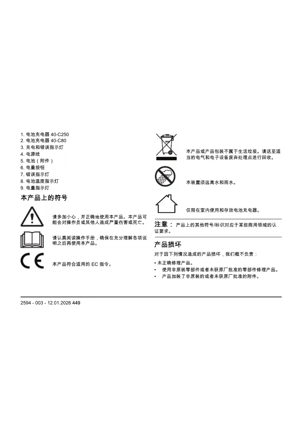警告: 请阅读所有安全警 告和所有说明。如不遵循警 告和说明,可能会导致触 电、火灾和/或严重伤害。 450 2594 - 003 - 12.01.2026• 只能使用电池充电器 40-C80, 40-C250 为 Husqvarna 正品电