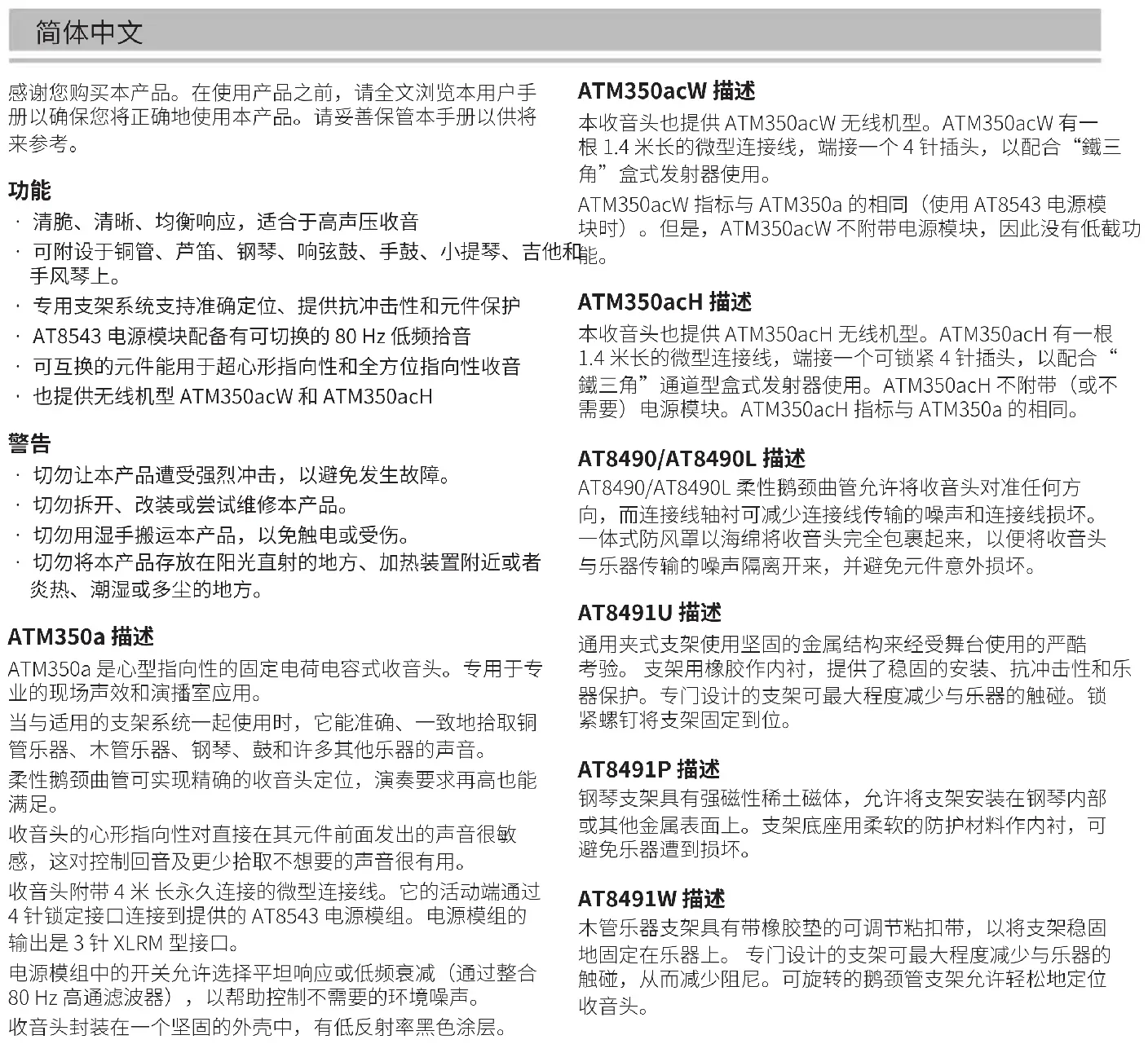 鐵三角”通道型盒式发射器使用。ATM350acH 不附带(或不 需要)电源模块。ATM350acH 指标与 ATM350a 的相同。 AT8490/AT8490L 描述 AT8490/AT8490L 柔性鹅颈曲管允许将收音头对准任何方 向,而连接线轴衬可减少连接线传输的噪声和连接线损坏。 一体式防风罩以海绵将收音头完全包裹起来,以便将收音头 与乐器传输的噪声隔离开来,并避免元件意外损坏。 AT8491U 描述 通用夹式支架使用坚固的金属结构来经受舞台使用的严酷 考验。 支架用橡胶作内衬,提供了稳固的安装、抗冲击性和乐 器保护。专门设计的支架可最大程度减少与乐器的触碰。锁 紧螺钉将支架固定到位。 AT8491P 描述 钢琴支架具有强磁性稀土磁体,允许将支架安装在钢琴内部 或其他金属表面上。支架底座用柔软的防护材料作内衬,可