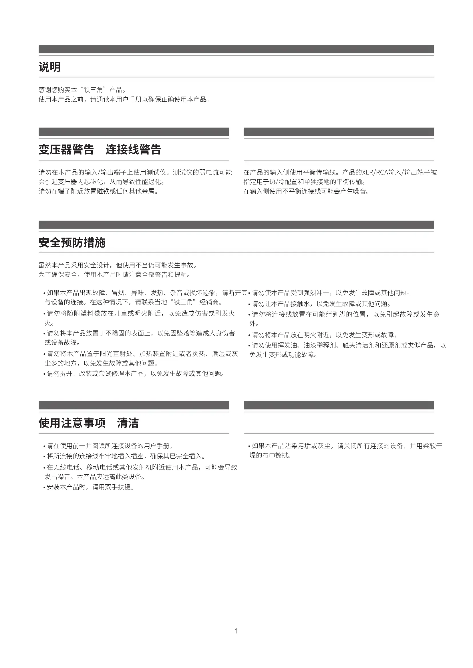 ·若本產品有發生故障丶冒煙丶異味丶發熱丶噪音或出現其他損壞跡象時,請停止使用本產品,並中斷與設備的連結。這種情況下,請聯繫當地的Audio-Technicala經銷商。