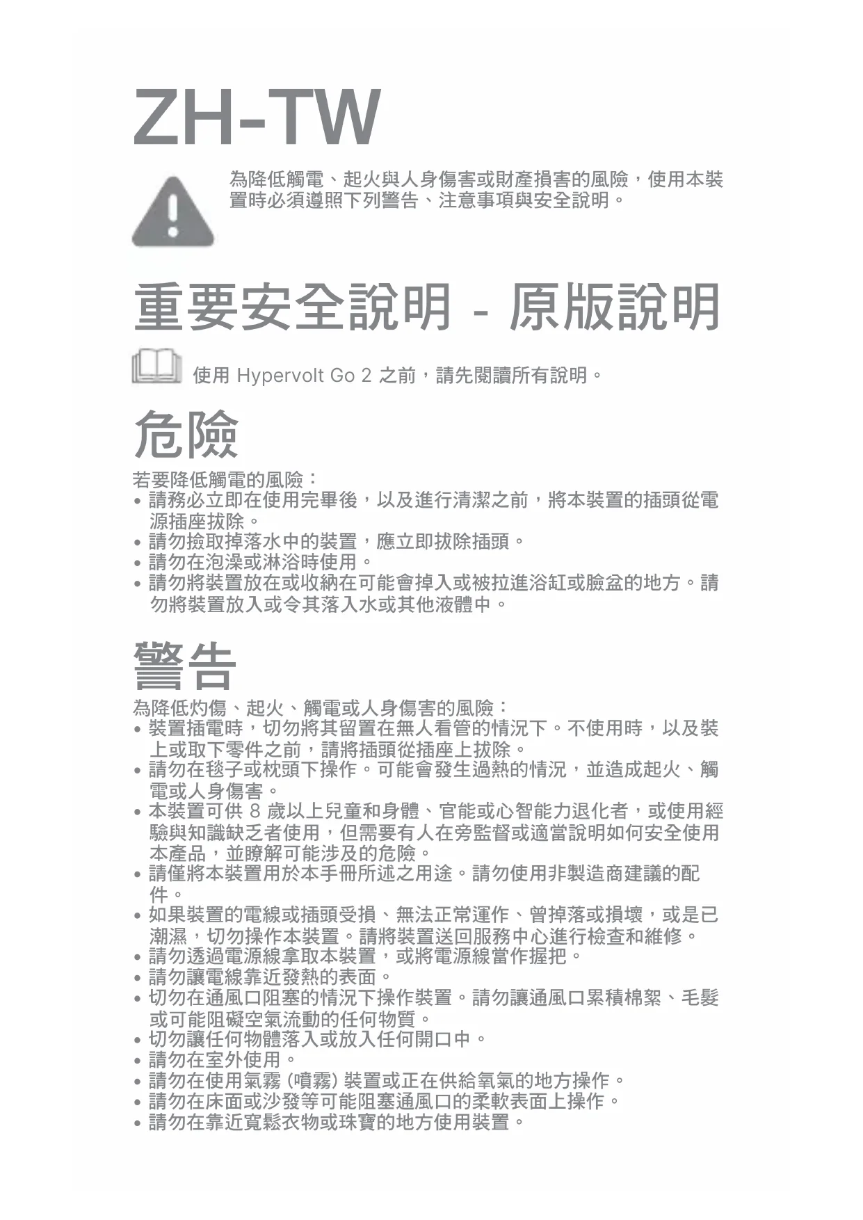 6為降低觸電、起火與人身傷害或財產損害的風險,使用本裝 置時必須遵照下列警告、注意事項與安全說明。 重要安全說明 - 原版說明 使用 Hypervolt Go 2 之前,請先閱讀所有說明。