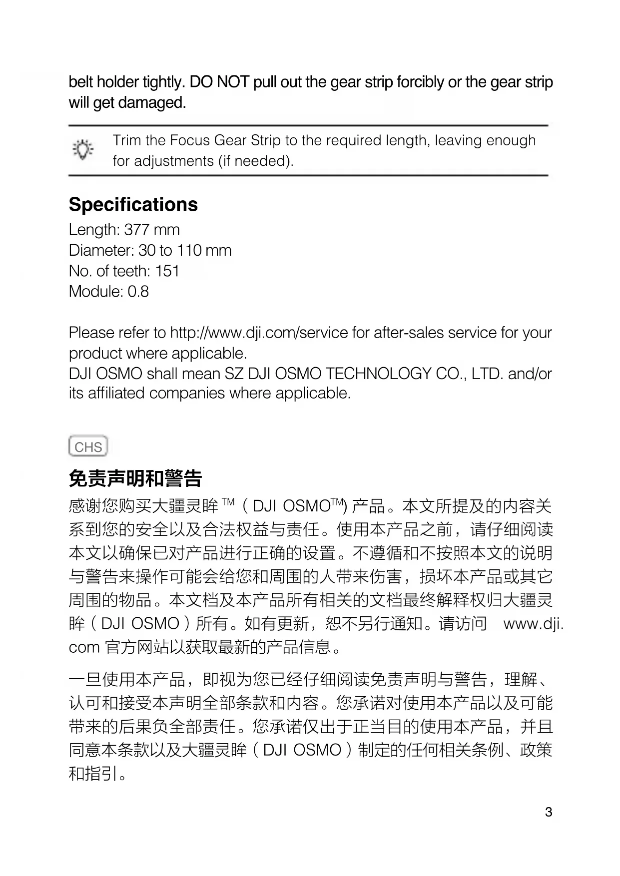 长度:377 mm 适配镜头口径范围:30 至 110 mm 齿数:151 模数:0.8 浏览 http://www.dji.com/service 以获取产品的售后信息。 “DJI OSMO”表示深圳市大疆灵眸科技有限公司及其关联公司。 CHT