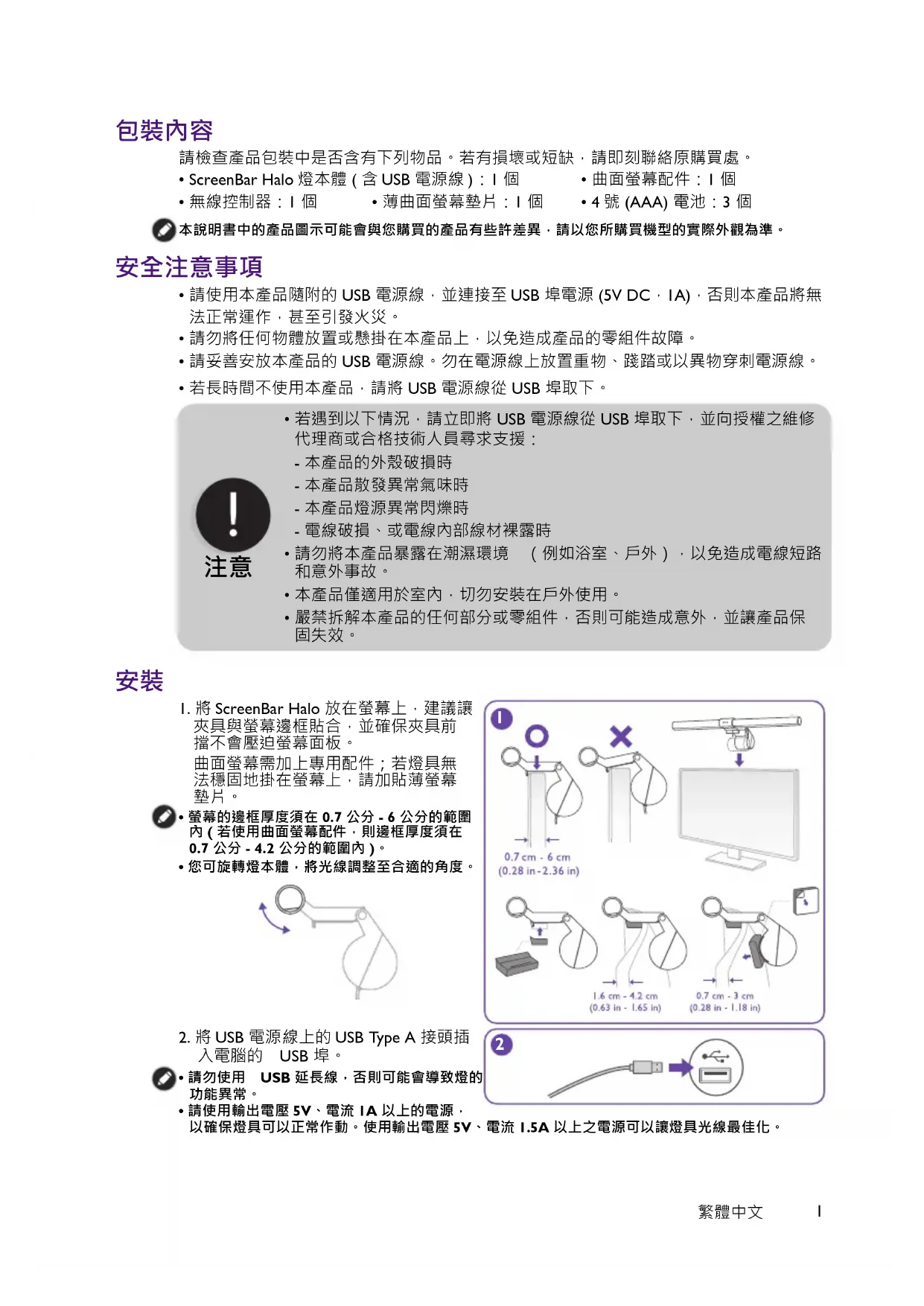- ScreenBar Halo 燈本體 ( 含 USB 電源線 ):1 個 • 曲面螢幕配件:1 個
