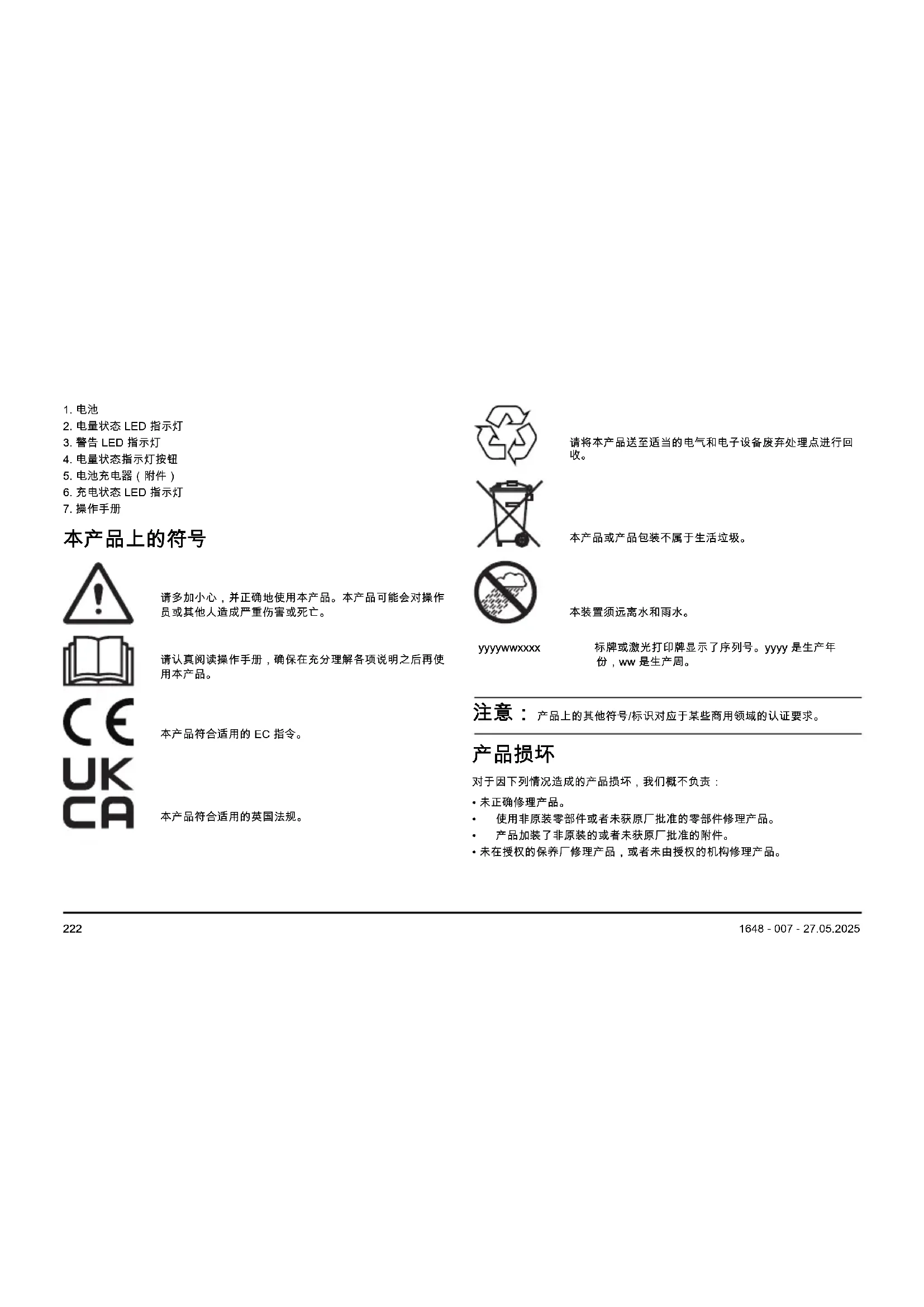 - 在存放电池之前,先将其清洁干净。 1648 - 007 - 27.05.2025 225弃置 该符号表示该产品不属于生活垃圾。请通过您当地的电气电子设备收集系统进 行回收。这有助于妥善管理报废设备。请联系当地主管部门、生活垃圾服务部 门、您的经销商或零售商获取相关信息。由于可能存在有害物质,不当处置可 能会对环境和人类健康造成潜在的负面影响。 注意: 产品或产品包装上显示有该符号。