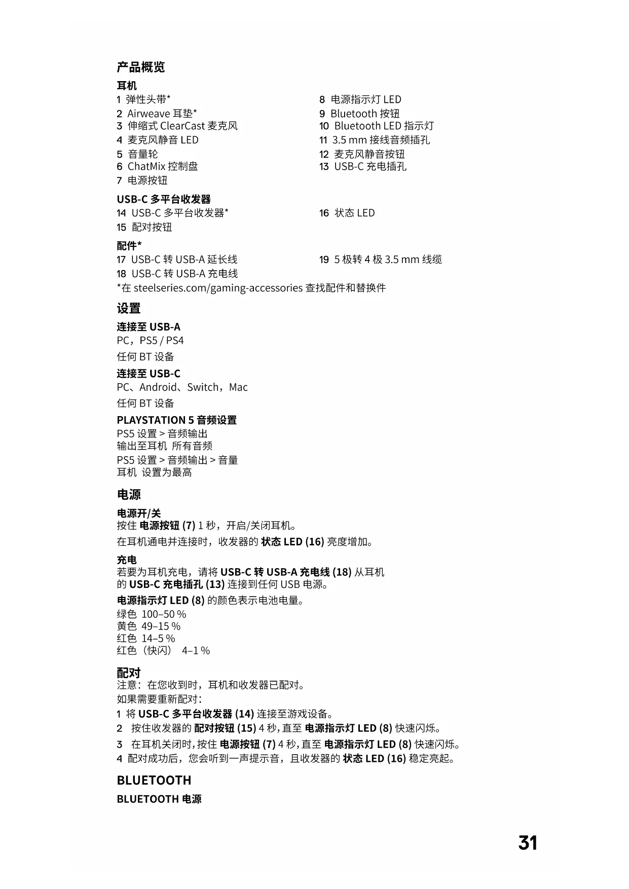 1 将 USB-C 多平台收发器 (14) 连接至游戏设备。 2 按住收发器的 配对按钮 (15) 4 秒,直至 电源指示灯 LED (8) 快速闪烁。 3 在耳机关闭时,按住 电源按钮 (7) 4 秒,直至 电源指示灯 LED (8) 快速闪烁。 4 配对成功后,您会听到一声提示音,且收发器的 状态 LED (16) 稳定亮起。 BLUETOOTH BLUETOOTH 电源32 按住 Bluetooth 按钮 (9) 1 秒,即可独立于 2.4 G 无线设备,开启/关闭 Bluetooth。