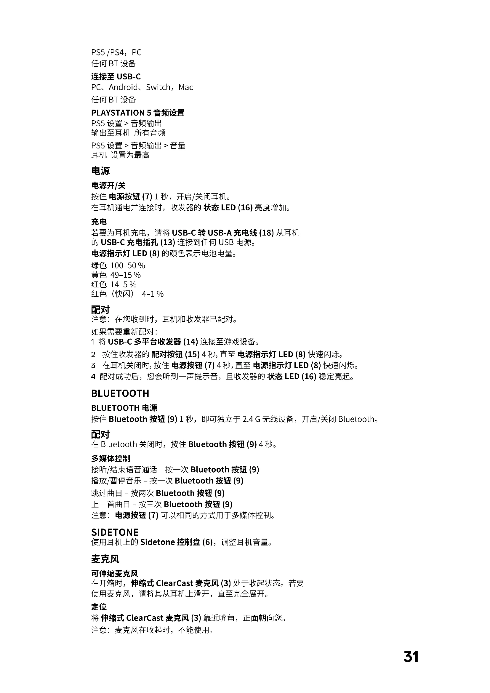 1 将 USB-C 多平台收发器 (14) 连接至游戏设备。 2 按住收发器的 配对按钮 (15) 4 秒,直至 电源指示灯 LED (8) 快速闪烁。 3 在耳机关闭时,按住 电源按钮 (7) 4 秒,直至 电源指示灯 LED (8) 快速闪烁。 4 配对成功后,您会听到一声提示音,且收发器的 状态 LED (16) 稳定亮起。 BLUETOOTH BLUETOOTH 电源 按住 Bluetooth 按钮 (9) 1 秒,即可独立于 2.4 G 无线设备,开启/关闭 Bluetooth。