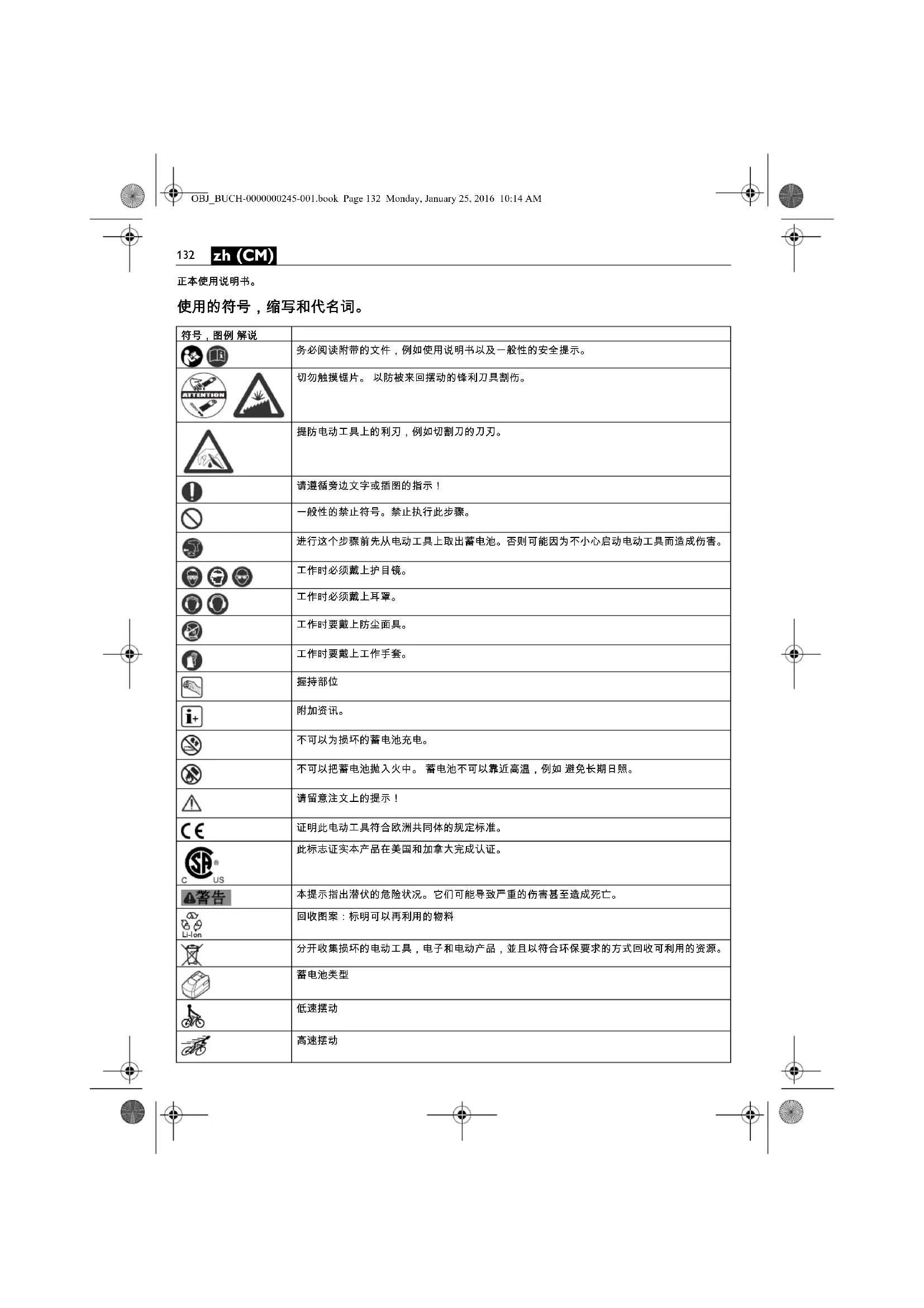 振荡发射值根据 EN 60745 ( 三向矢量和 )m, s, kg, A, mm, V, W, Hz, N, °C, dB, min, m/s 米,秒,公斤,安培,毫米,伏特,瓦,赫兹,牛顿,摄氏,分贝,分,米/秒 国际性单位系统 SI 中的标准单位和引用单位。 OBJ_BUCH-0000000245-001.book Page 133 Monday, January 25, 2016 10:14 AM134 zh (CM) 电动工具必须配上 FEIN 原厂蓄电池一起使用。 使用以下的蓄电池和替以下的蓄电池充电有火灾和 / 或爆炸的危险: 不苻的电池 , 已经损坏的电池,经过修理或改装过的电池,仿冒品和其它品牌的电池。遵循充电器的使用说明书中的安全规章。 处理对身体有危害的废尘 使用本机器时可能会产生有害健康的废尘。接触或呼吸了某些废尘,例如:石棉尘和有石棉成分的废尘,含铅的颜料尘,金属尘,某些种类的木尘,矿物尘,研磨含矿物工件而产生的矽尘,含颜料稀释剂的废尘,含木材保护剂的废尘以及含防腐蚀剂的废尘等,可能出现过敏现象和 / 或造成呼吸道疾病,癌症以及影响生殖能力。吸入废尘后的致病可能性,需视曝露在危尘中的程度而定。操作机器时必须使用合适而且合格的吸尘装备,以及佩戴个人的防护装备,另外也要保持工作场所的良好通风状况。加工含石棉工件的工作必须交给专业人员执行。木尘和轻建材尘,研磨热尘和化学材料的混合物,都可能在特定状况下产生自燃或者造成爆炸。避免让火花喷向集尘箱。防止电动工具和被研磨物过热。定时清倒集尘箱。注意工件制造商所提出的有关加工时的注意事项,而且要兼顾贵国有关加工该工件的法规。 手掌 - 手臂 - 震动 本说明书中引用的震动水平,是采用 EN 60745 中规定的测量方式所测得。这个震动水平值可以作为电动工具之间的比较标准。您也可以拿它来推测机器目前的震动受荷状况。此震动水平只适用在以电动工具进行规定的用途时。如果未按照规定使用电动工具,在机器上安装了不合适的工具,或者未确实执行机器的维修工作,实际的震动水平会异于提供的震动水平。因此在操作过程结束后,机器的震动受荷状况会明显提高。为了准确地评估机器的震动受荷状况,还必须考虑以下的时间因素:例如关机的时间或机器空转待命的时间等。如果把整个工作过程中累加的关机或待命时间列入考虑,则可以明显地降低机器的震动受荷状况。为了保护操作者免受机器震动危害,必须另外采行防护措施,例如:做好电动工具和安装工具的维修工作,手掌要保持温暖,安排好工作的流程。