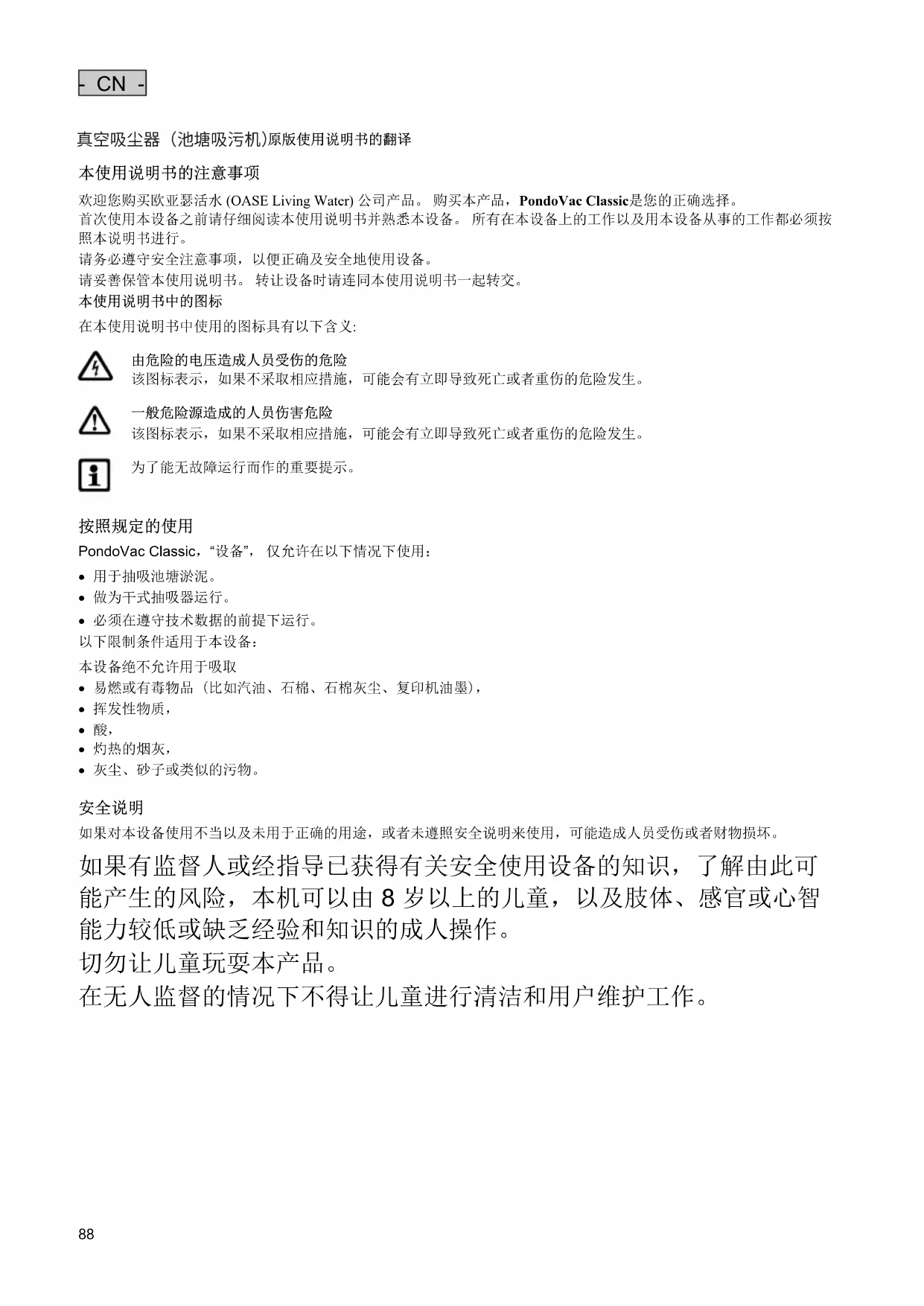 如果对本设备使用不当以及未用于正确的用途,或者未遵照安全说明来使用,可能造成人员受伤或者财物损坏。 如果有监督人或经指导已获得有关安全使用设备的知识,了解由此可 能产生的风险,本机可以由 8 岁以上的儿童,以及肢体、感官或心智 能力较低或缺乏经验和知识的成人操作。 切勿让儿童玩耍本产品。 在无人监督的情况下不得让儿童进行清洁和用户维护工作。 真空吸尘器(池塘吸污机)- CN -