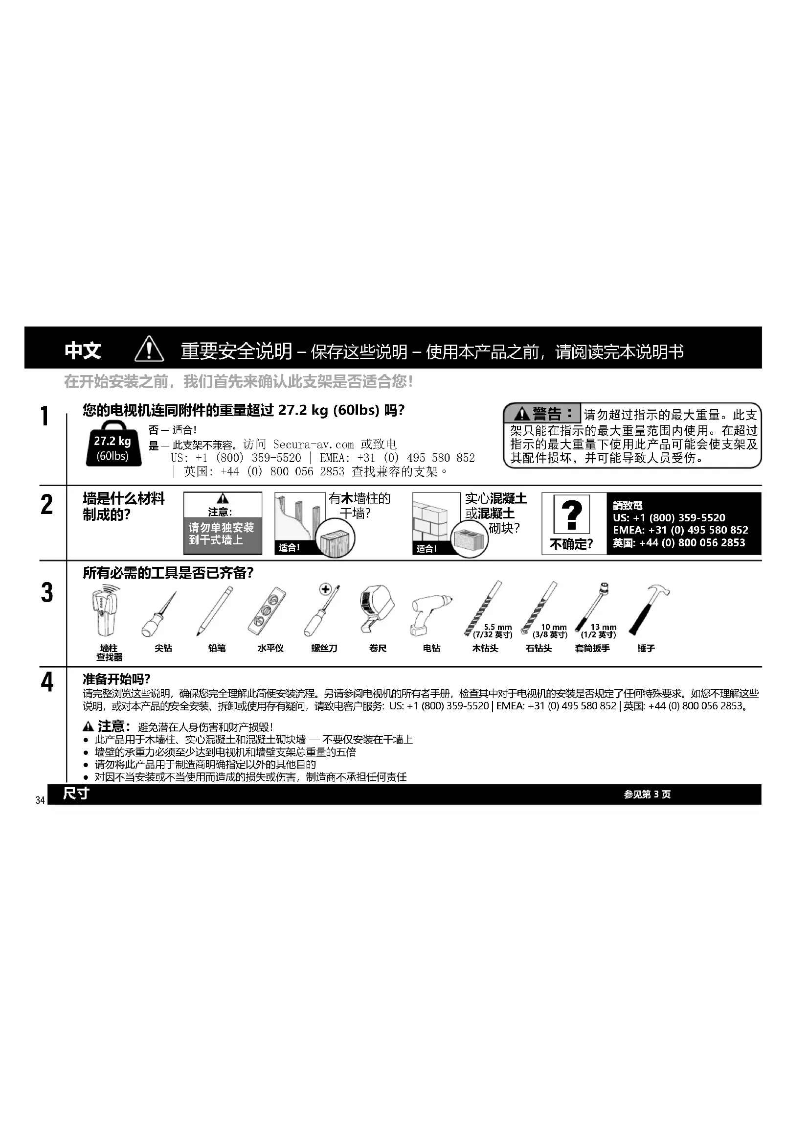 警告: 请勿超过指示的最大重量。此支 架只能在指示的最大重量范围内使用。在超过指示的最大重量下使用此产品可能会使支架及其配件损坏,并可能导致人员受伤。 重要安全说明 – 保存这些说明 – 使用本产品之前,请阅读完本说明书 准备开始吗?请完整浏览这些说明,确保您完全理解此简便安装流程。另请参阅电视机的所有者手册,检查其中对于电视机的安装是否规定了任何特殊要求。如您不理解这些说明,或对本产品的安全安装、拆卸或使用存有疑问,请致电客户服务: US: +1 (800) 359-5520 | EMEA: +31 (0) 495 580 852 | 英国: +44 (0) 800 056 2853。 注意:避免潜在人身伤害和财产损毁! ● 此产品用于木墙柱、实心混凝土和混凝土砌块墙 — 不要仅安装在干墙上 ● 墙壁的承重力必须至少达到电视机和墙壁支架总重量的五倍● 请勿将此产品用于制造商明确指定以外的其他目的 ● 对因不当安装或不当使用而造成的损失或伤害,制造商不承担任何责任 在开始安装之前,我们首先来确认此支架是否适合您!