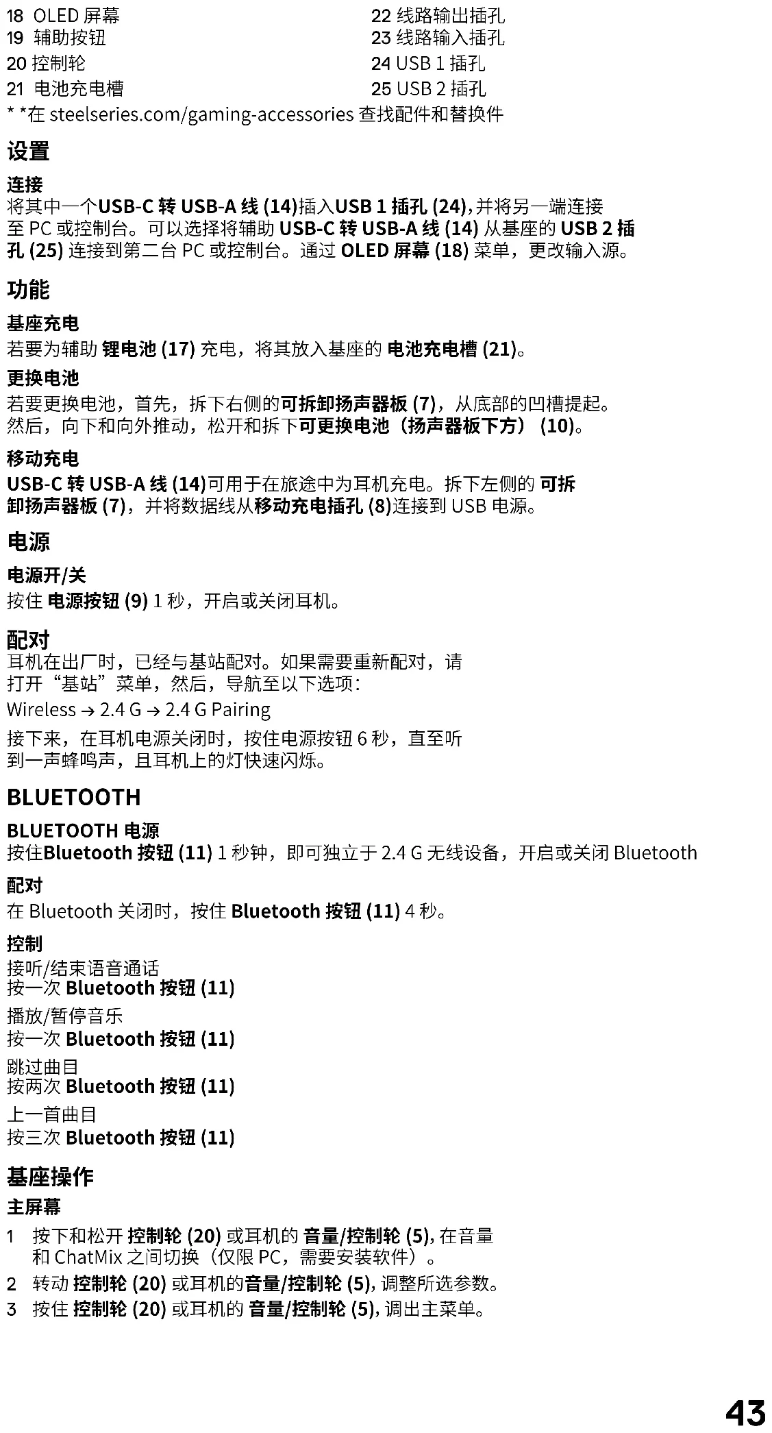 14 USB-C 转 USB-A 数据线 (x2) 15 4 极 3.5 mm 音频线 16 麦克风防风罩 17 锂电池 (x2) 无线基座43 18 OLED 屏幕 19 辅助按钮 20 控制轮 21 电池充电槽 22 线路输出插孔 23 线路输入插孔 24 USB 1 插孔 25 USB 2 插孔
