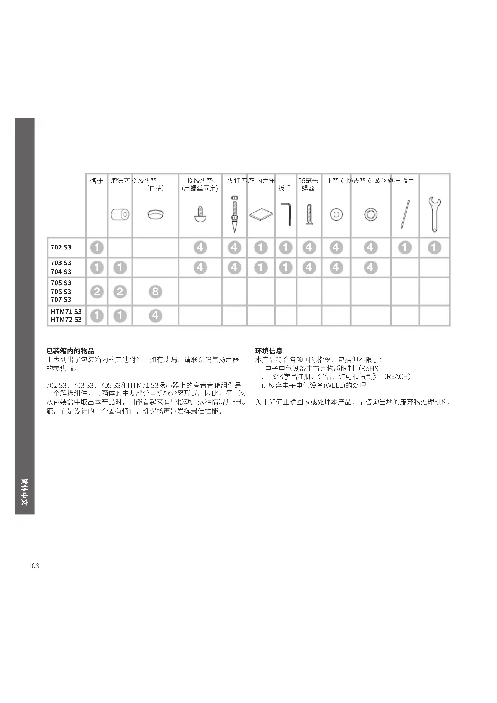 上表列出了包装箱内的其他附件。如有遗漏,请联系销售扬声器