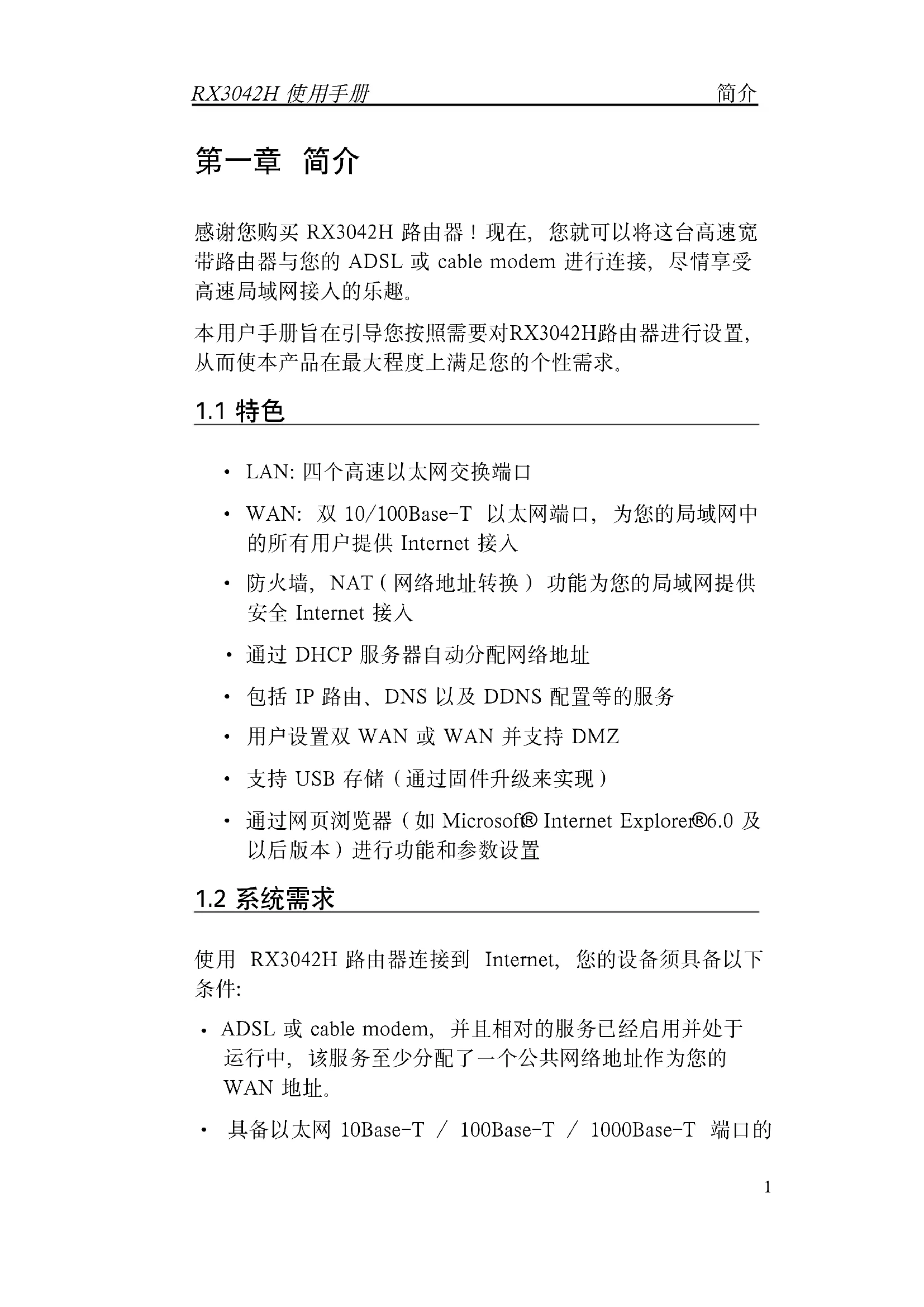 感谢您购买 RX3042H 路由器!现在,您就可以将这台高速宽 带路由器与您的 ADSL 或 cable modem 进行连接,尽情享受 高速局域网接入的乐趣。 本用户手册旨在引导您按照需要对RX3042H路由器进行设置, 从而使本产品在最大程度上满足您的个性需求。
