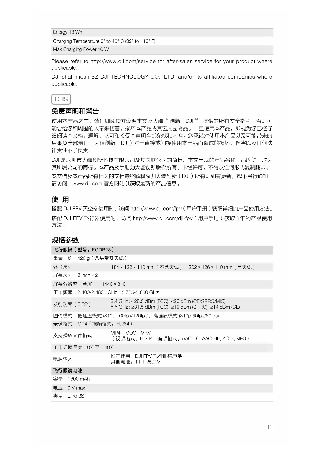 建議使用 DJI FPV 飛行眼鏡電池 其他電池:11.1-25.2 V 二次鋰電行動電源(飛行眼鏡電池) 容量 1800 mAh 電壓 9 V max 類型 LiPo 2S 能量 18 Wh 充電環境溫度 0℃ 至 45℃ 最大充電功率 10 W13 瀏覽 http://www.dji.com/service 以取得產品的售後資訊。 「DJI」代表深圳市大疆創新科技有限公司及其附屬公司。