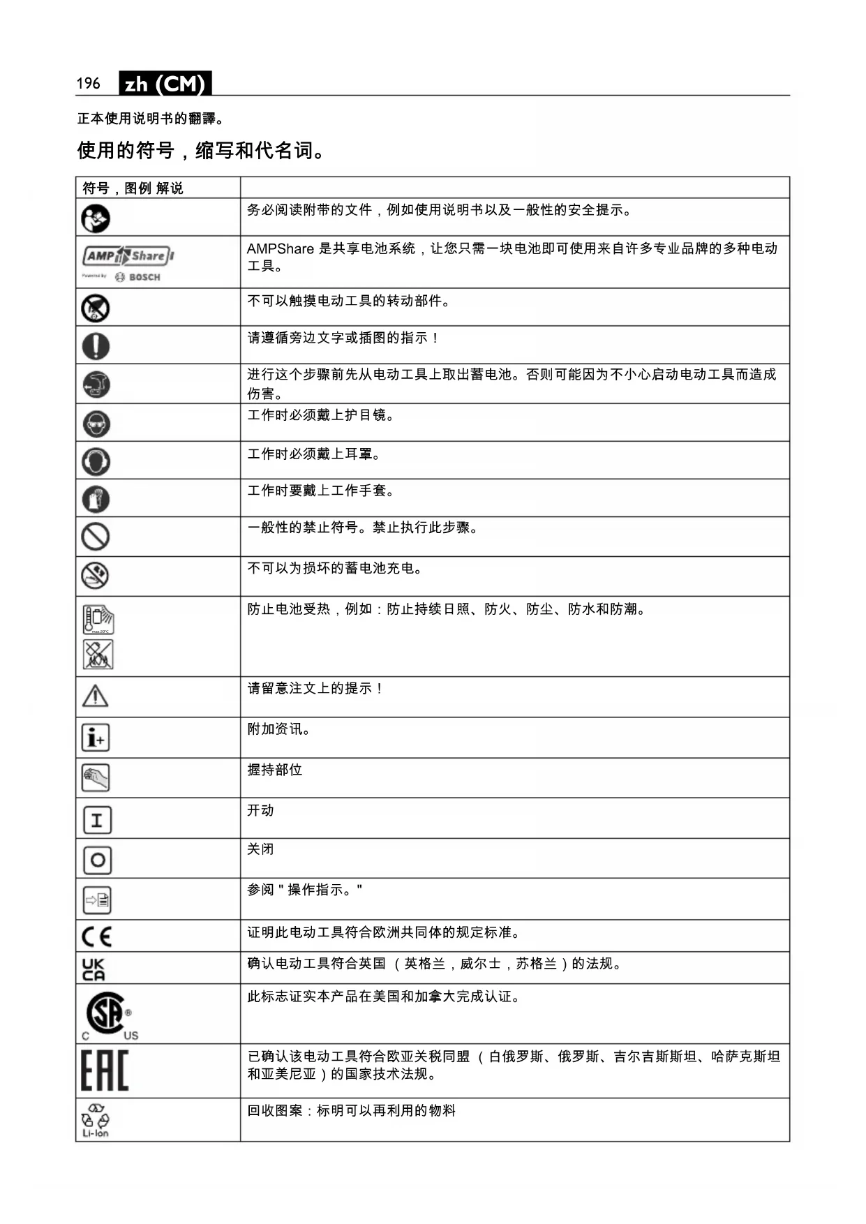 参阅 " 操作指示。" 证明此电动工具符合欧洲共同体的规定标准。 确认电动工具符合英国 (英格兰,威尔士,苏格兰)的法规。 此标志证实本产品在美国和加拿大完成认证。 已确认该电动工具符合欧亚关税同盟 (白俄罗斯、俄罗斯、吉尔吉斯斯坦、哈萨克斯坦 和亚美尼亚)的国家技术法规。 回收图案:标明可以再利用的物料 max.50°C197 zh (CM) 分开收集损坏的电动工具,电子和电动产品,並且以符合环保要求的方式回收可利用的