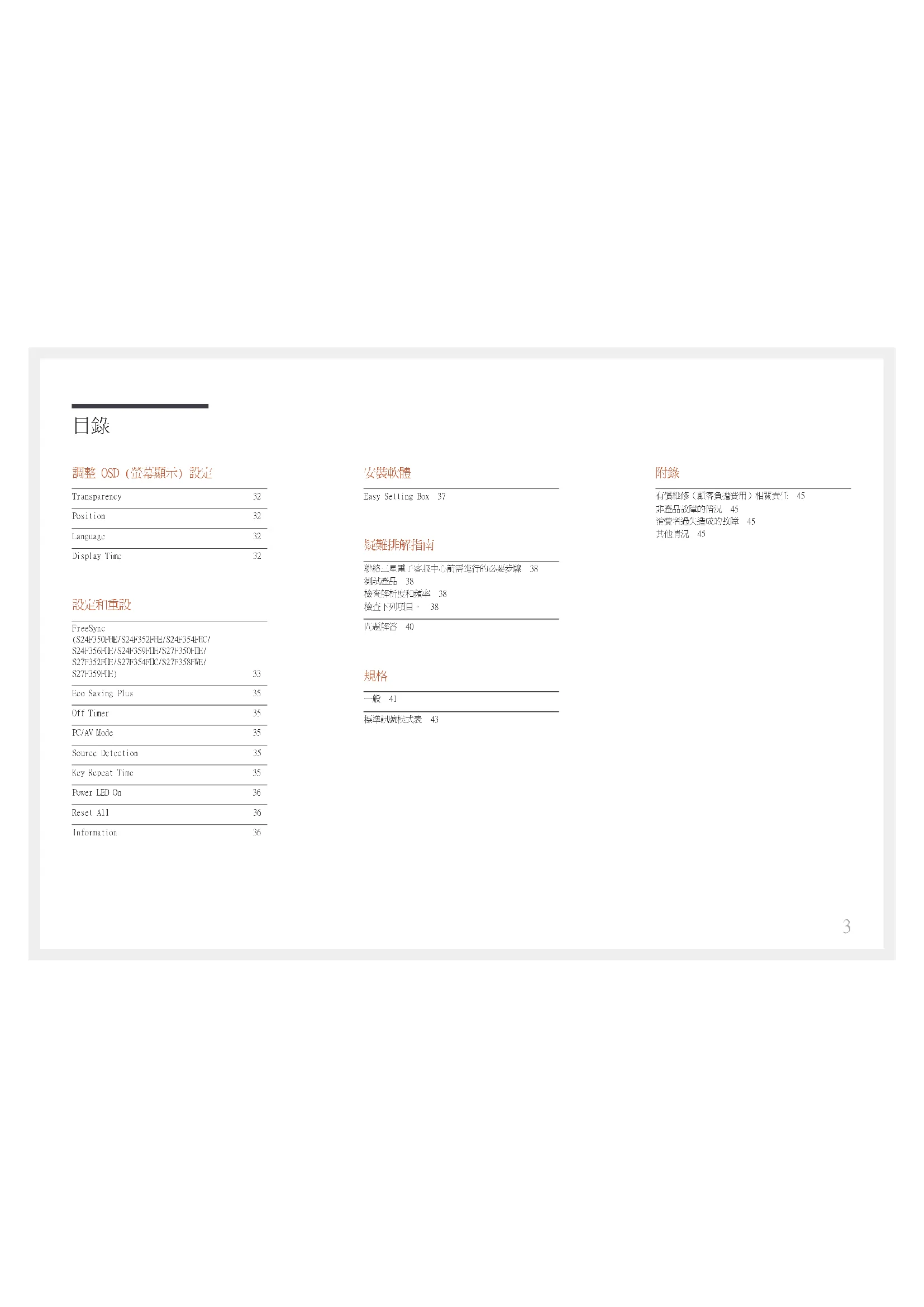 聯絡三星電子客服中心前需進行的必要步驟 38 測試產品 38 檢查解析度和頻率 38 檢查下列項目。 38 問題解答 40
