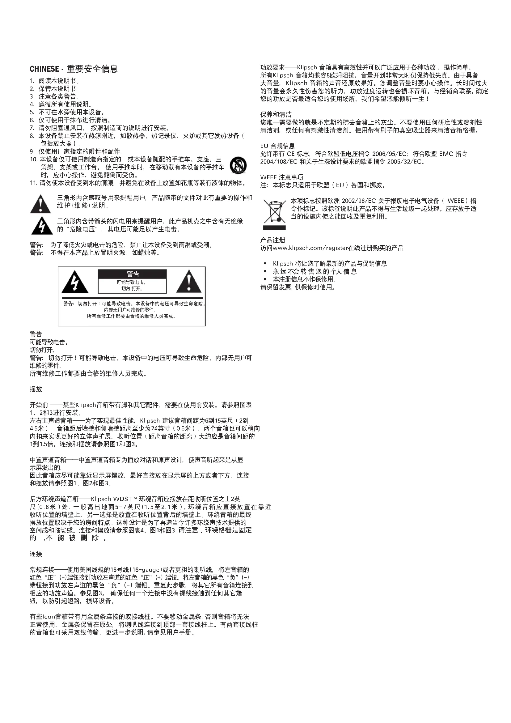常规连接——使用美国线规的16号线(16-gauge)或者更粗的喇叭线,将左音箱的 红色“正”(+)端钮接到功放左声道的红色“正”(+) 端钮。将左音箱的黑色“负”(-) 端钮接到功放左声道的黑色“负”(-) 端钮。重复此步骤,将其它所有音箱连接到 相应的功放声道。参见图3。 确保任何一个连接中没有裸线接触到任何其它端 钮,以防引起短路,损坏设备。 有些Icon音箱带有用金属条连接的双接线柱。不要移动金属条,否则音箱将无法 正常使用。金属条保留在原处,将喇叭线连接到顶部一套接线柱上。有两套接线柱 的音箱也可采用双线传输。更进一步说明,请参见用户手册。 功放要求——Klipsch 音箱具有高效性并可以广泛应用于各种功放 ,操作简单。 所有Klipsch 音箱均兼容8欧姆阻抗,音量开到非常大时仍保持低失真。由于具备 大音量,Klipsch 音箱的声音还原效果好。您调整音量时要小心操作。长时间过大 的音量会永久性伤害您的听力,功放过度运转也会损坏音箱。与经销商联系,确定 您的功放是否最适合您的使用场所。我们希望您能倾听一生!