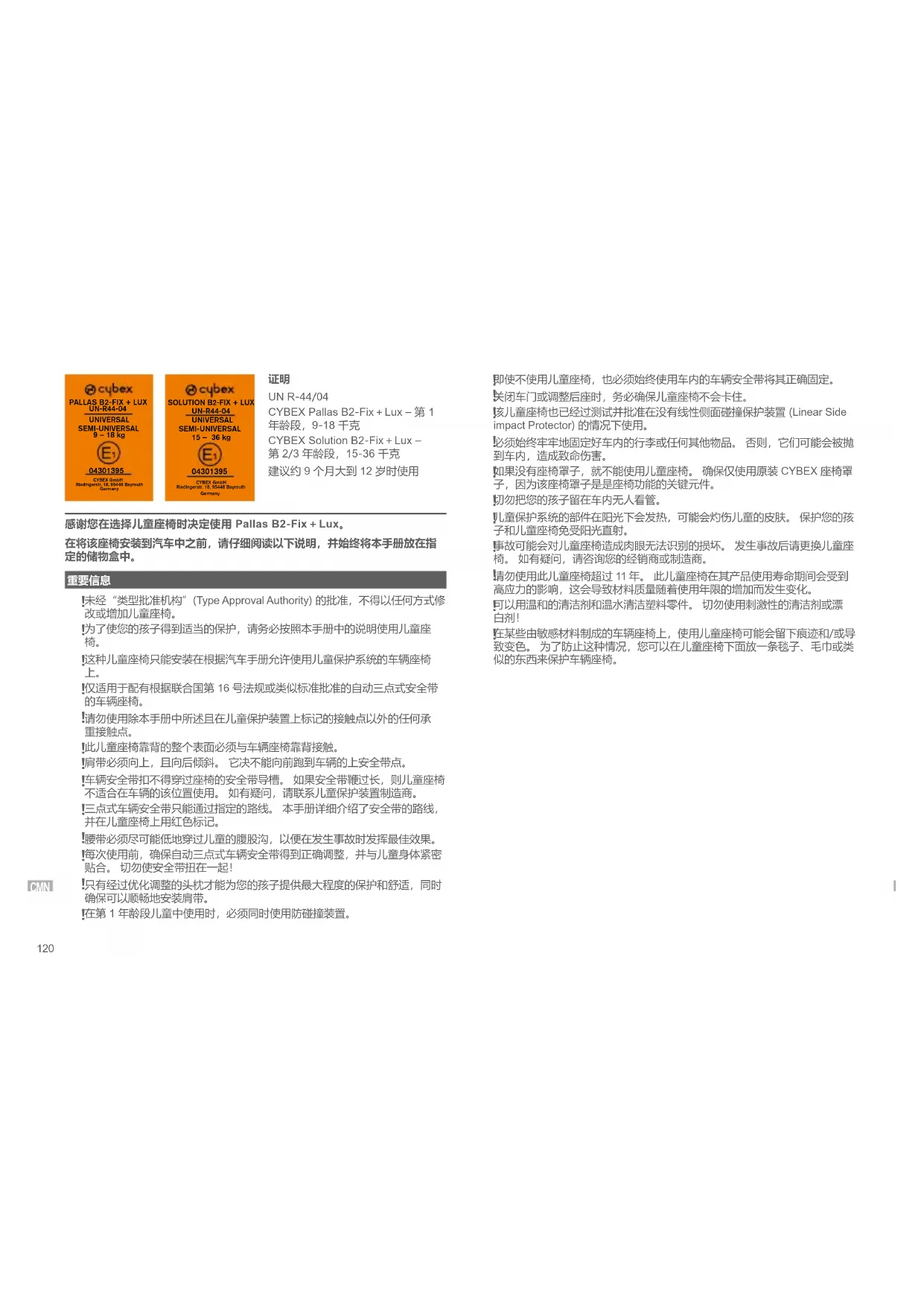 CYBEX GmbH (Riedingerr. 18, 95448 Bayreuth, Germany) 为您提供 3 年保 修。 保修在零售商最初向客户出售该产品的国家/地区有效。 我们的主页 (go.cybex-online.com/manufacturer-warranty-car-seats) 上提供了保修内容 和请求保修时所需提供的所有基本信息。 如果产品说明中显示了保修,则您对 我们的缺陷享有的法律权利将不受影响。 请遵守您所在国家/地区的废物处理规定。 CMN123 PALLAS B2-FIX + LUXUN-R44-04UNIVERSALSEMI-UNIVERSAL9 – 18 kgCYBEX GmbHRiedingerstr. 18, 95448 BayreuthGermany SOLUTION B2-FIX + LUXUN-R44-04UNIVERSALSEMI-UNIVERSAL15 – 36 kgCYBEX GmbHRiedingerstr. 18, 95448 BayreuthGermany
