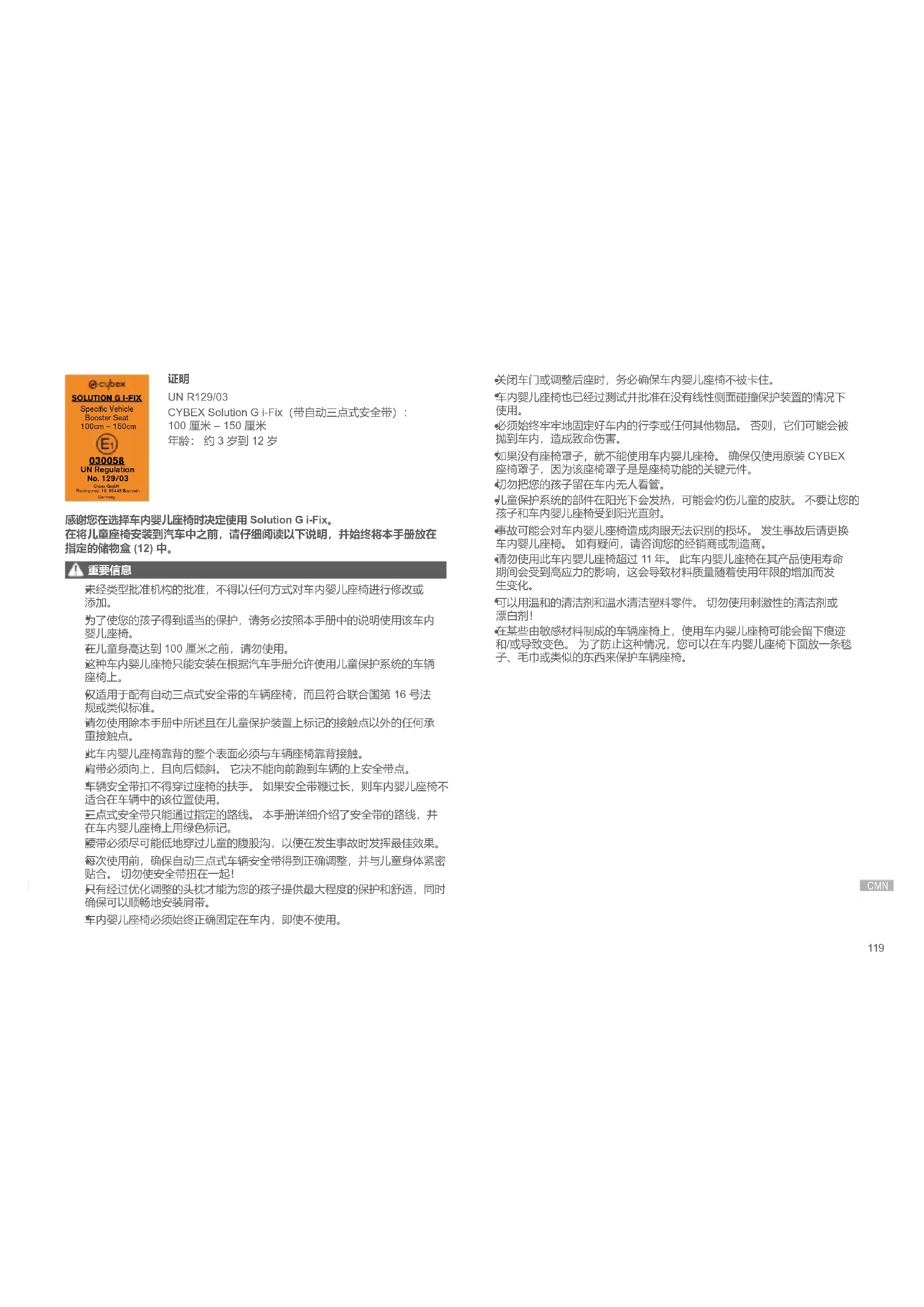 UN R129/03 CYBEX Solution G i-Fix(带自动三点式安全带): 100 厘米 – 150 厘米 年龄: 约 3 岁到 12 岁 感谢您在选择车内婴儿座椅时决定使用 Solution G i-Fix。 在将儿童座椅安装到汽车中之前,请仔细阅读以下说明,并始终将本手册放在 指定的储物盒 (12) 中。