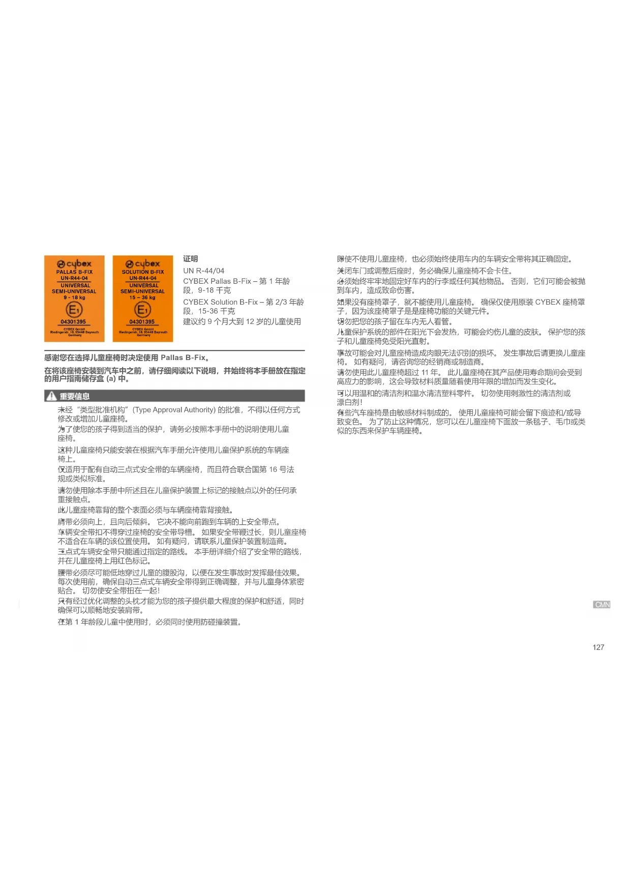 CYBEX GmbH (Riedingerstr. 18, 95448 Bayreuth, Germany) 为您提供 3 年保 修。 保修在零售商最初向客户出售该产品的国家/地区有效。 我们的主页 (go.cybex-online.com/manufacturer-warranty-car-seats) 上提供了保修内 容和请求保修时所需提供的所有基本信息。 如果产品说明中显示了保修,则您 对我们的缺陷享有的法律权利将不受影响。 请遵守您所在国家/地区的废物处理规定。130 PALLAS B-FIX UN-R44-04 UNIVERSAL SEMI-UNIVERSAL