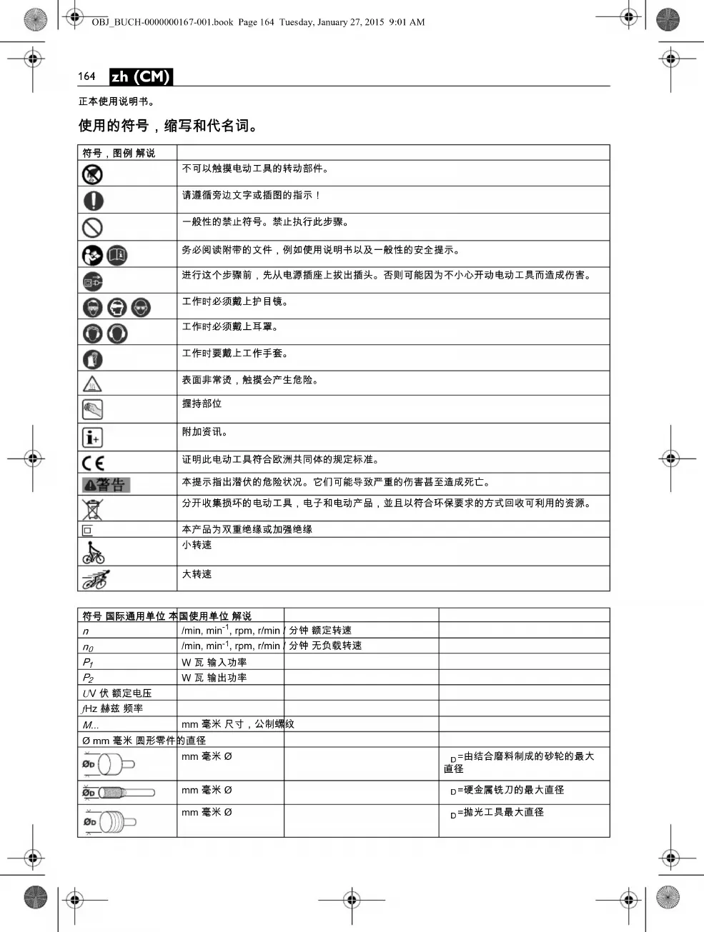 米,秒,公斤,安培,毫米,伏特,瓦,赫兹,牛顿,摄氏,分贝, 分,米/秒 国际性单位系统 SI 中的标准单位和引用单位。符号 国际通用单位 本国使用单位 解说OBJ_BUCH-0000000167-001.book Page 165 Tuesday, January 27, 2015 9:01 AM166 zh (CM) 可能的话要使用老虎钳固定好工件。千万不可以用一只手 握着小的工件, 而使用另外一只手操作电动工具。 固定好 小的工件之后,才能够空出双手好好地操控电动工具。切 割园的工件例如木钉,长条物料或管子时, 因为上述物料 容易滚开,可能导致安装在机器上的安装件被卡住并且朝
