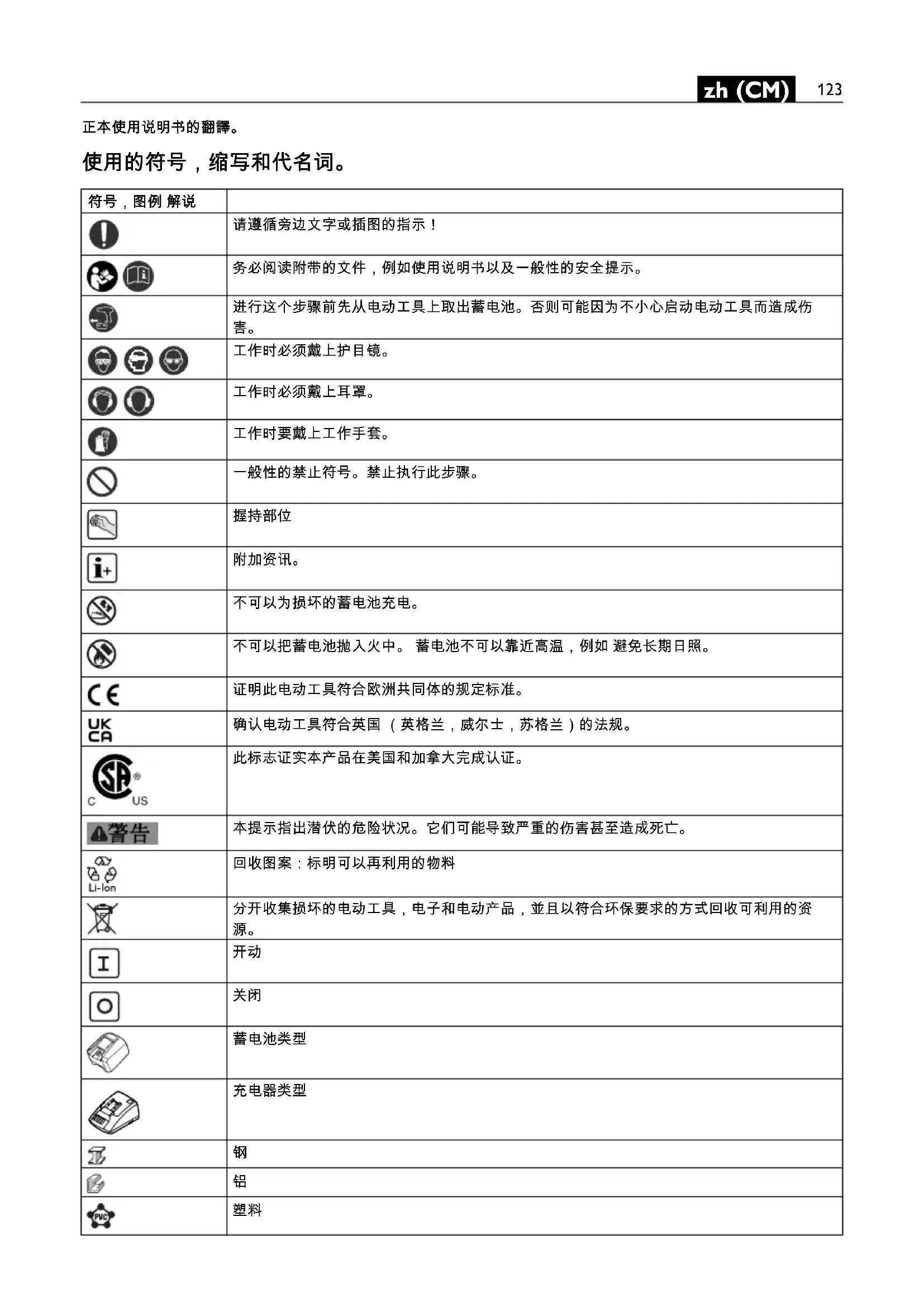 不可以为损坏的蓄电池充电。 不可以把蓄电池抛入火中。 蓄电池不可以靠近高温,例如 避免长期日照。 证明此电动工具符合欧洲共同体的规定标准。 确认电动工具符合英国 (英格兰,威尔士,苏格兰)的法规。 此标志证实本产品在美国和加拿大完成认证。 本提示指出潜伏的危险状况。它们可能导致严重的伤害甚至造成死亡。 回收图案:标明可以再利用的物料 分开收集损坏的电动工具,电子和电动产品,並且以符合环保要求的方式回收可利用的资