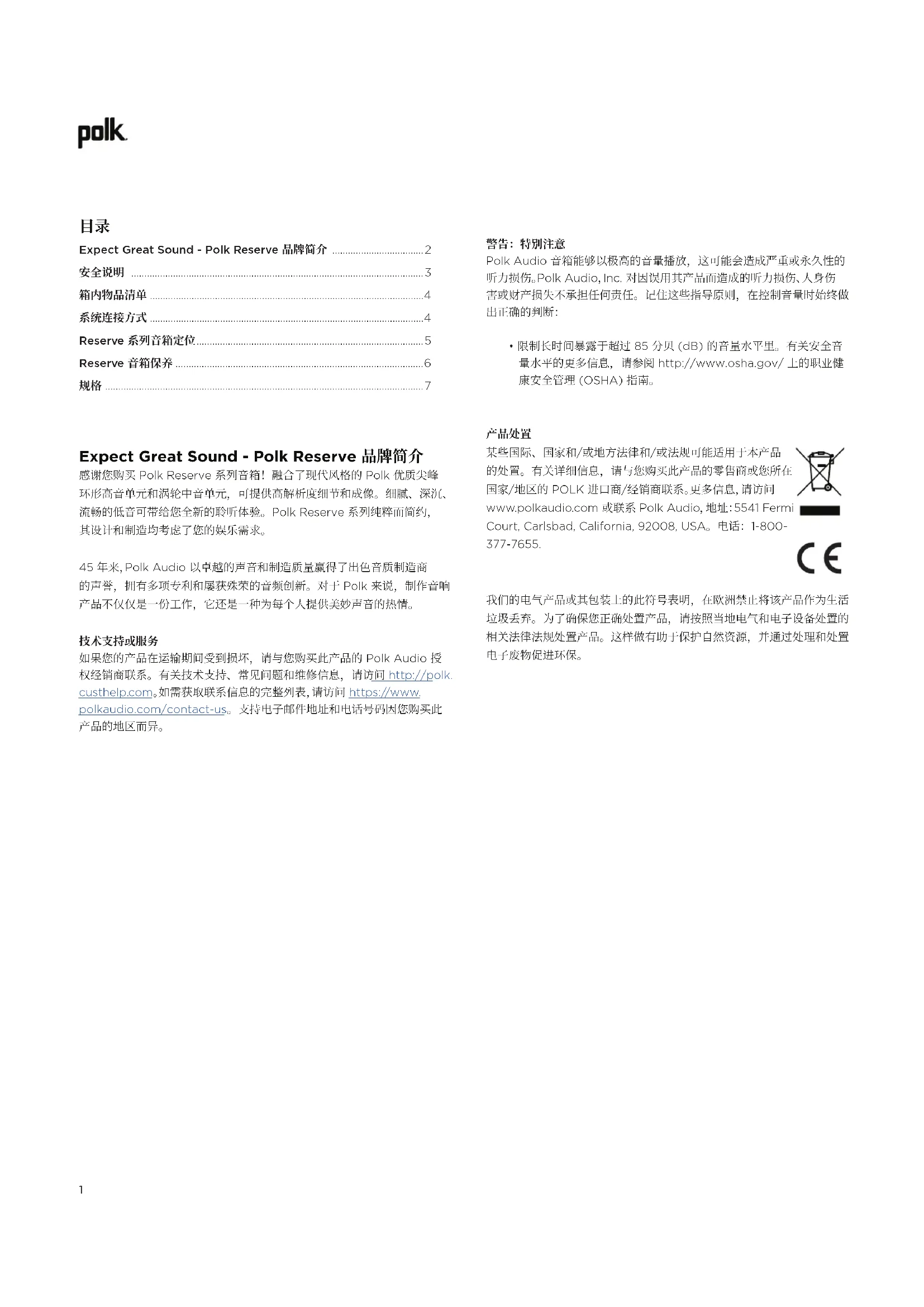 Expect Great Sound - Polk Reserve 品牌简介 感谢您购买 Polk Reserve 系列音箱!融合了现代风格的 Polk 优质尖峰 环形高音单元和涡轮中音单元,可提供高解析度细节和成像。细腻、深沉、 流畅的低音可带给您全新的聆听体验。Polk Reserve 系列纯粹而简约, 其设计和制造均考虑了您的娱乐需求。 45 年来,Polk Audio 以卓越的声音和制造质量赢得了出色音质制造商 的声誉,拥有多项专利和屡获殊荣的音频创新。对于 Polk 来说,制作音响 产品不仅仅是一份工作,它还是一种为每个人提供美妙声音的热情。