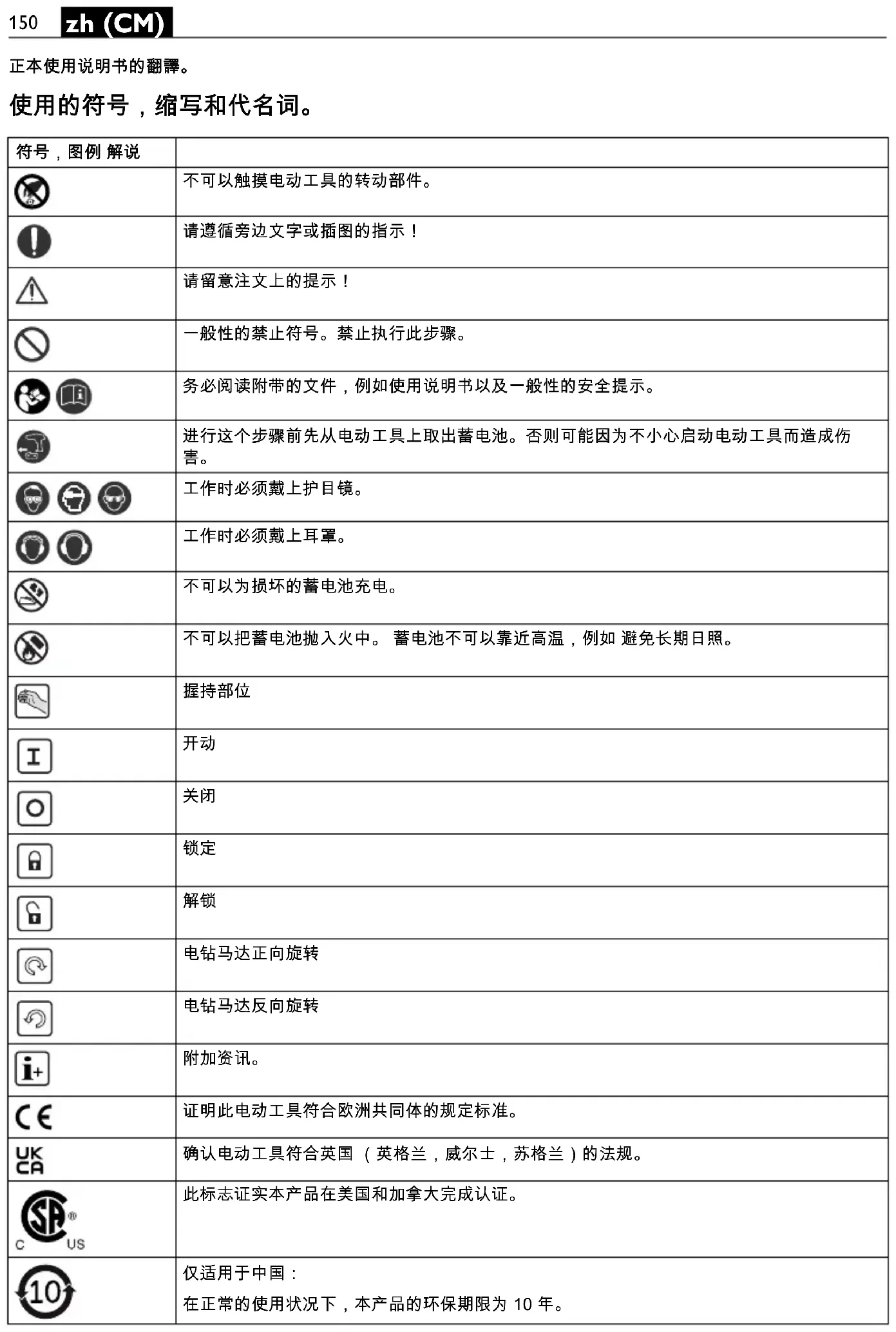在正常的使用状况下,本产品的环保期限为 10 年。151 zh (CM) 本提示指出潜伏的危险状况。它们可能导致严重的伤害甚至造成死亡。 回收图案:标明可以再利用的物料 分开收集损坏的电动工具,电子和电动产品,並且以符合环保要求的方式回收可利用的资
