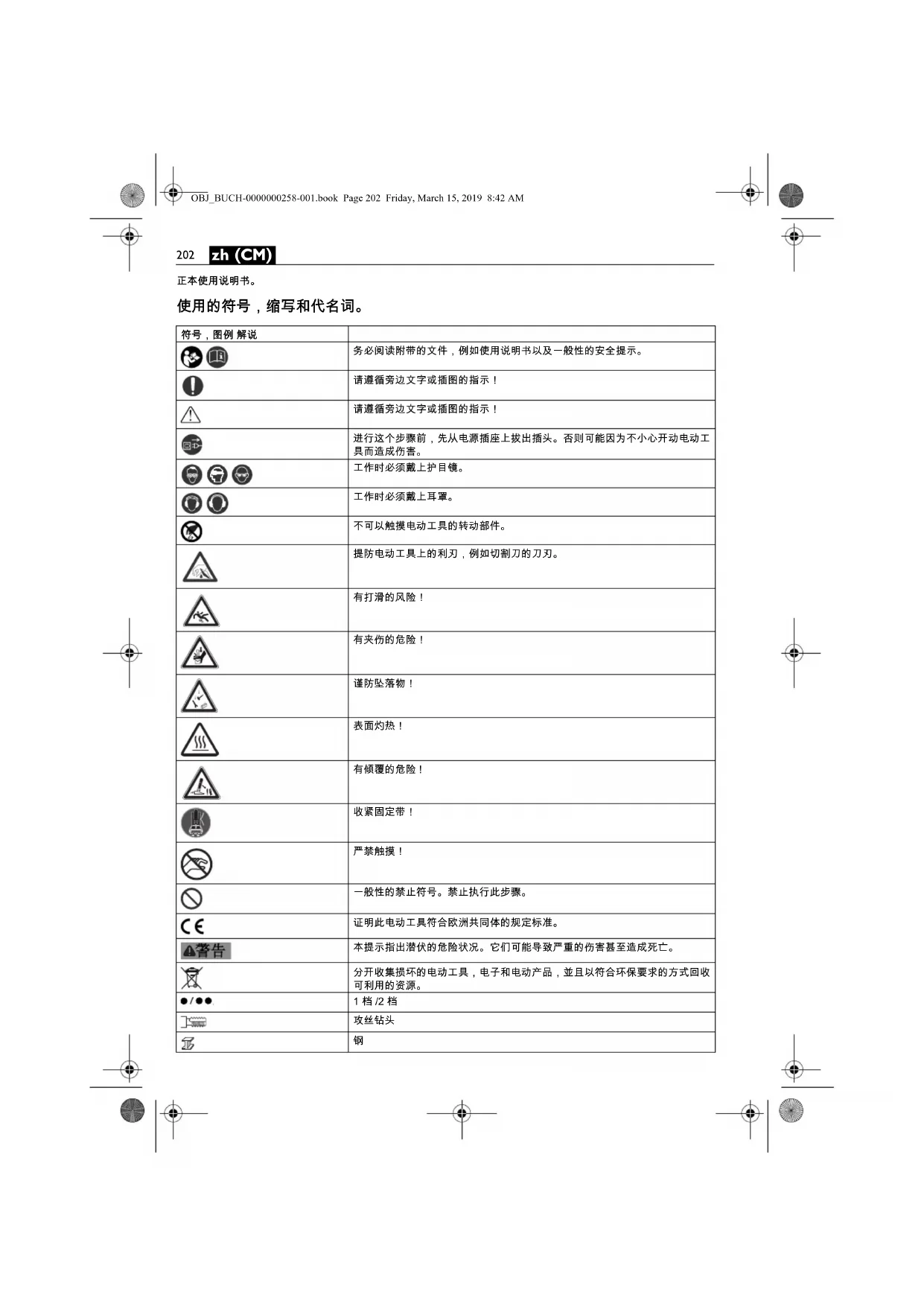 在使用前請一定先檢查人員保護開關 (*) 是否能正常工作 ( 見頁面 213)。 手掌 - 手臂 - 震動 本說明書中引用的震動水平,是采用 EN 62841 中規定 的測量方式所測得。這個震動水平值可以作為電動工具 之間的比較標準。您也可以拿它來推測機器目前的震動