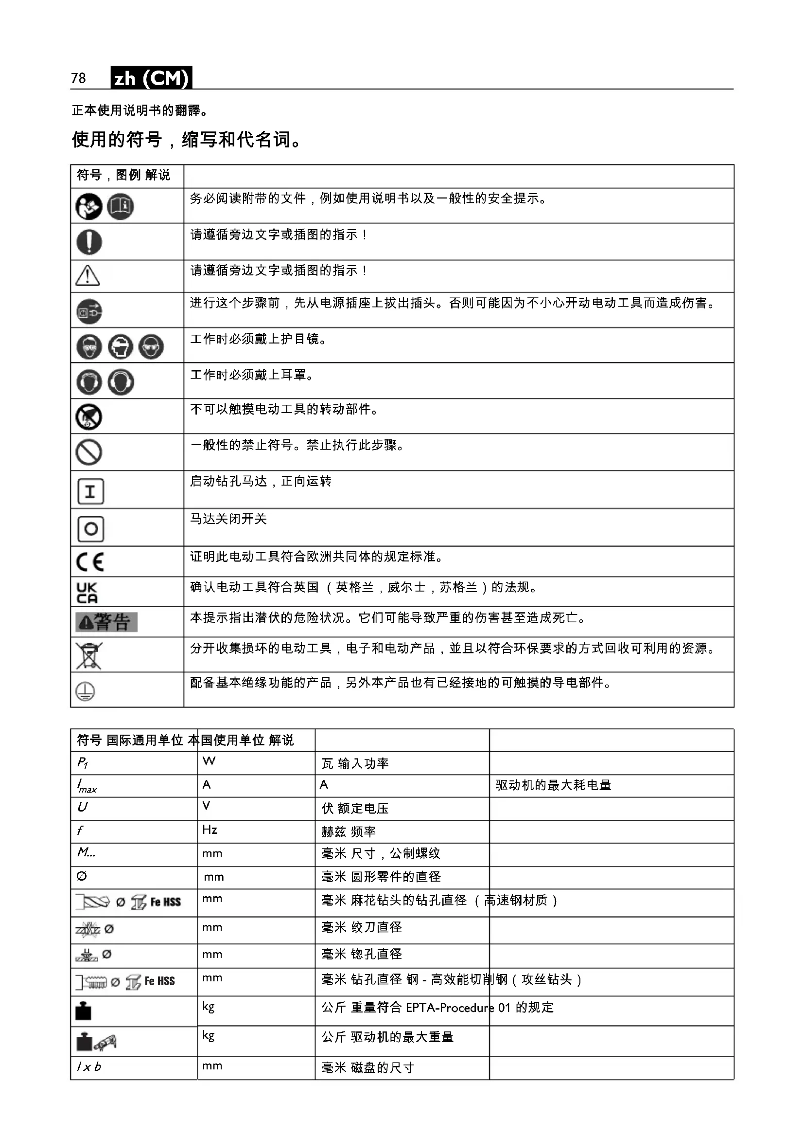 证明此电动工具符合欧洲共同体的规定标准。 确认电动工具符合英国 (英格兰,威尔士,苏格兰)的法规。 本提示指出潜伏的危险状况。它们可能导致严重的伤害甚至造成死亡。 分开收集损坏的电动工具,电子和电动产品,並且以符合环保要求的方式回收可利用的资源。 配备基本绝缘功能的产品,另外本产品也有已经接地的可触摸的导电部件。 符号 国际通用单位 本国使用单位 解说