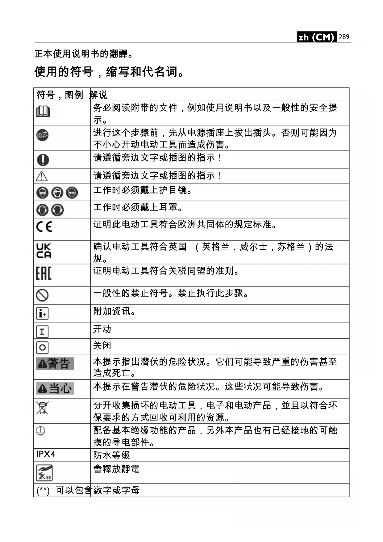 本提示在警告潜伏的危险状况。这些状况可能导致伤害。 分开收集损坏的电动工具,电子和电动产品,並且以符合环 保要求的方式回收可利用的资源。 配备基本绝缘功能的产品,另外本产品也有已经接地的可触