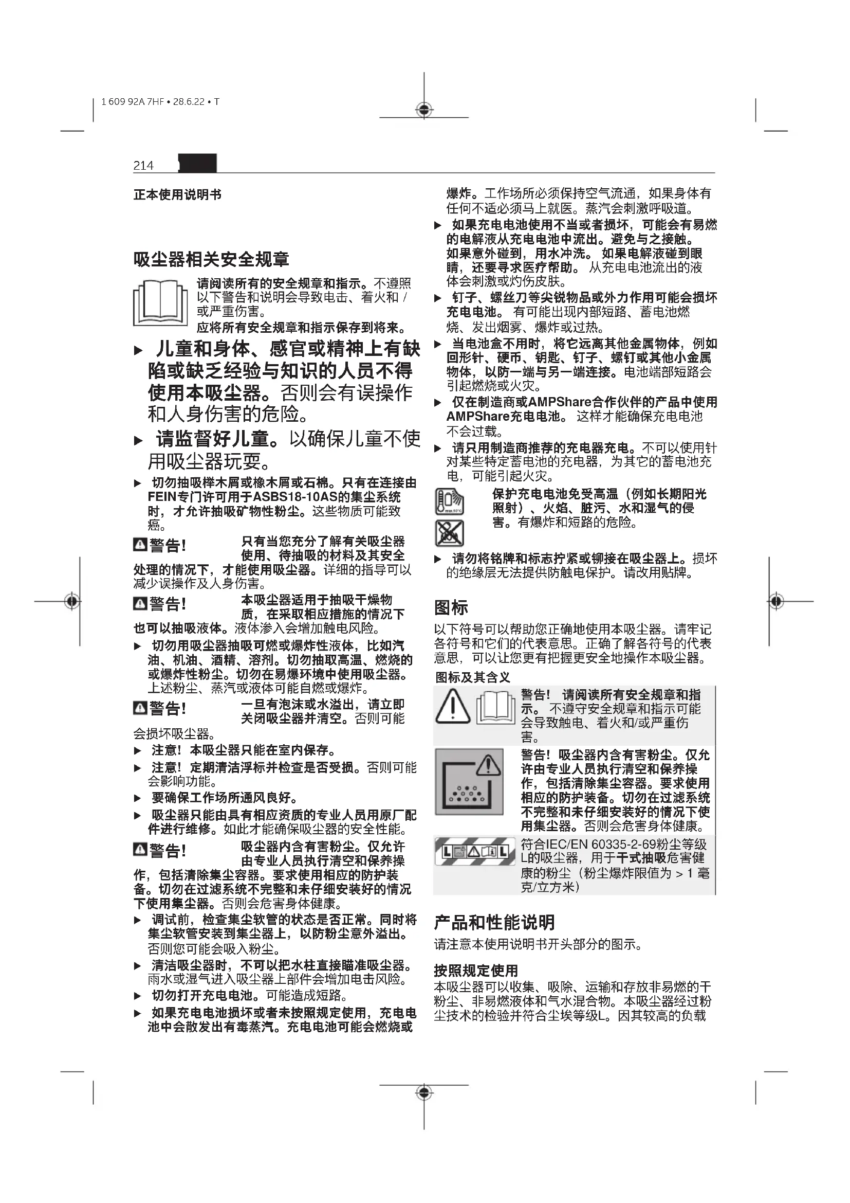 本吸尘器可以收集、吸除、运输和存放非易燃的干 粉尘、非易燃液体和气水混合物。本吸尘器经过粉 尘技术的检验并符合尘埃等级L。因其较高的负载 214 zh 1 609 92A 7HF • 28.6.22 • T适合使用在商业用途中,例如手工业、工业和修理