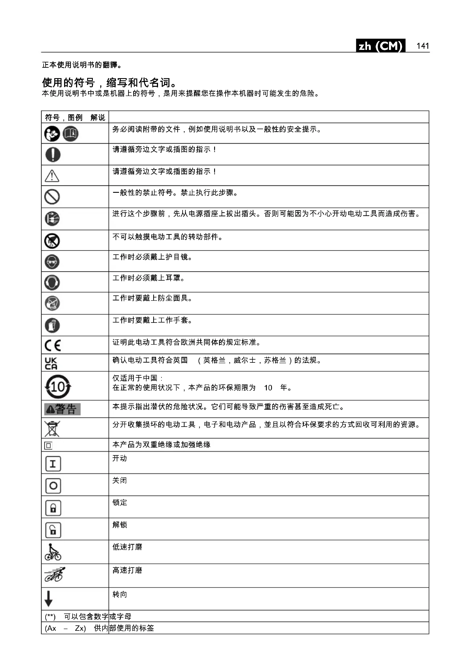在正常的使用状况下,本产品的环保期限为 10 年。 本提示指出潜伏的危险状况。它们可能导致严重的伤害甚至造成死亡。 分开收集损坏的电动工具,电子和电动产品,並且以符合环保要求的方式回收可利用的资源。 本产品为双重绝缘或加强绝缘
