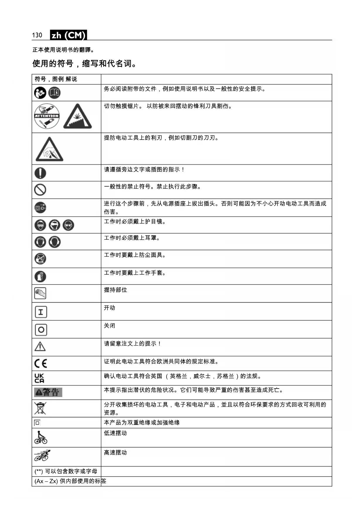 阅读所有的安全规章和指示。如未遵循安全规章和指示,可能遭受电击,产生火灾和 /或造成严重伤害。妥善保存所有的安全规章和指示以便日后查阅。详细阅读並彻底了解本使用说明书和附带的 " 一般性安全规章 " (书目码 34130465060) 后,才可以使用本电动工具。妥善保存上述文件以方便日后查阅。赠送或贩卖本电动工具时,务必把这些文件转交给受赠者或买主。同时也要注意各国有关的工作安全规定。 手提式振荡研磨切割机,安装了 FEIN 认可的安装件和附件, 可以不须用水冲刷在能够遮蔽风雨的环境中。– 拆除小客车,大卡车和巴士的玻璃时,可以使用本机器割除残留的聚氨酯粘胶瘤– 锯割车身面板和去除底层保护材料。– 研磨车身的其它部位。该电动工具不适用于锯木材及其类似材料。此时请使用如 FEIN MM 700 MAX。本电动工具也可以连接在足够功率的交流电发电机上使用。该发电机必须苻合 ISO 8528 的标准并且是 G2 装备等级。但是如果逾越了 10 % 的所谓畸变因素 , 便不算苻合上述的标准。如有疑问必须询问有关发电机的细节。 如果工作时可能钻穿隐藏著的电线或机器本身的电线。 一定要握著绝缘手柄操作机器。 电动工具如果接触了带电的电线,机器上的金属部件会导电,並可能造成操作 使用夹子或其它的固定方式,把工件固定和支撑在稳固的底座上。 如果用手握住或以身体顶住工件,无法固定好工件,容易发生失控的情况。只能使用电动工具制造商特别设计和许可的附件。 即使能够将其它的工具安装到本电动工具上,並不代表能够确保操作安全。注意工作时的持机姿势,特别是当锯片或刀具朝向持机范围时,千万不可以接触安装在机器上的工具。 触摸了利刃或锋利的边缘可能被割伤。戴上防护用品。根据适用情况,使用面罩,安全护目镜或安全眼镜。适用时,戴上防尘面具,听力保护器,手套和能挡小磨料或工件碎片的工作围裙。 眼防护罩必须挡住各种操作产生的飞屑。防尘面具或口罩必须能够过滤操作产生的颗粒。长期暴露在高强度噪音中会引起失 电动工具不可以指向您自己,其他人或动物。 锋利或炙热的安装工具可能造成伤害。切勿使用螺丝或钉子在电动工具上固定铭牌和标签。 如果破坏了机器的绝缘功能便无法防止电击。定期使用非金属工具清洁电动工具的通风孔。 马达的风扇会把灰尘吸入机壳中。机器内部如果堆积了大量的金属尘容易造成触电。操作前必须检查电线和插头是否有任何损坏。我们的建议 : 操作本电动工具时,务必要连接最多 30 mA 额定剩馀电流 的漏电断路器 (RCD) 。符号 国际通用单位 本国使用单位 解说