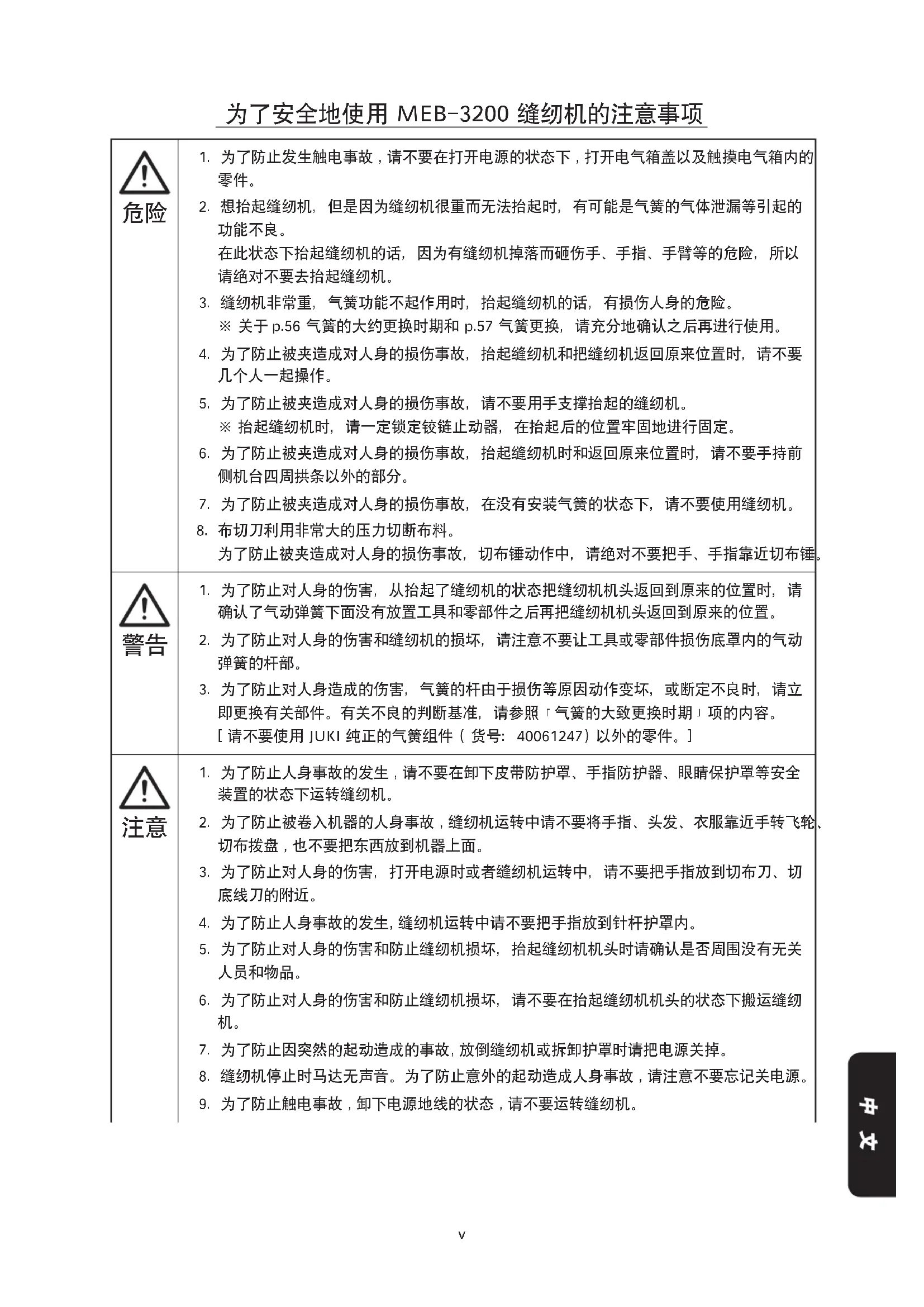 7. 为了防止被夹造成对人身的损伤事故,在没有安装气簧的状态下,请不要使用缝纫机。