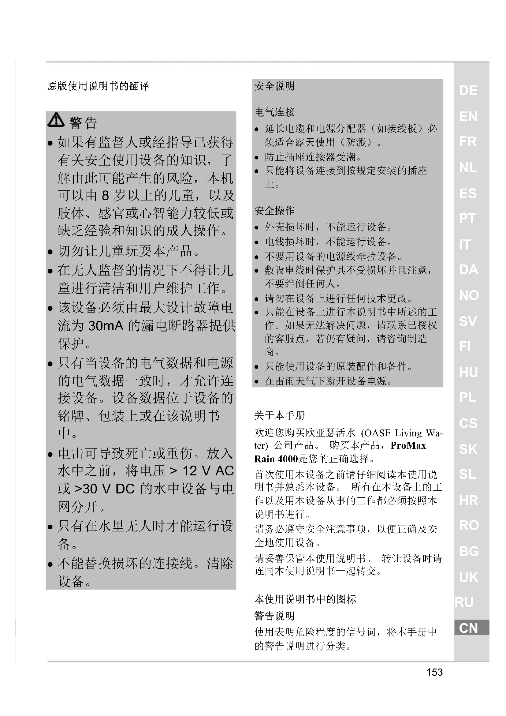 欢迎您购买欧亚瑟活水 (OASE Living Wa- ter) 公司产品。 购买本产品,ProMax Rain 4000是您的正确选择。 首次使用本设备之前请仔细阅读本使用说 明书并熟悉本设备。 所有在本设备上的工 作以及用本设备从事的工作都必须按照本