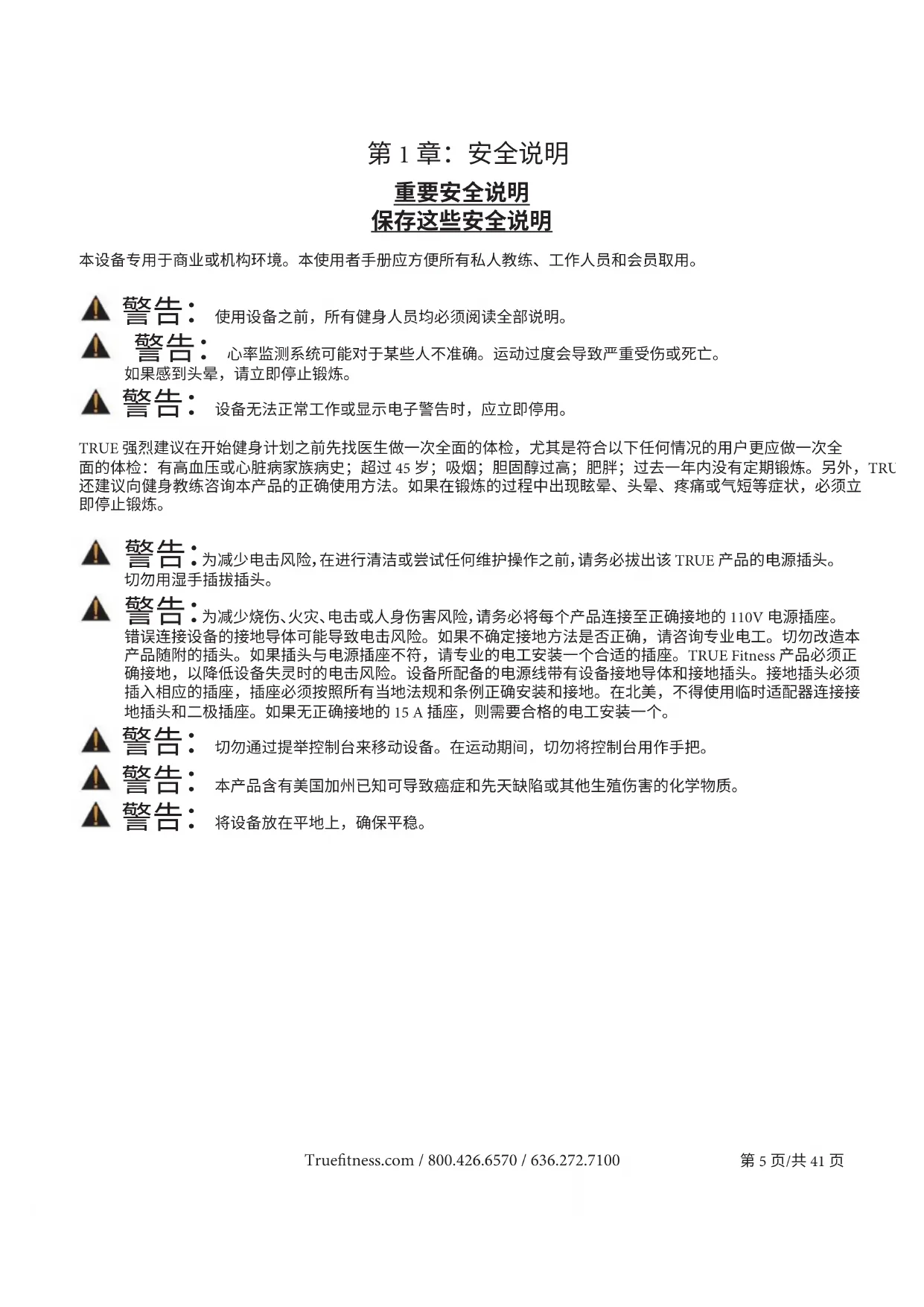 警告:为减少烧伤、火灾、电击或人身伤害风险,请务必将每个产品连接至正确接地的 110V 电源插座。 错误连接设备的接地导体可能导致电击风险。如果不确定接地方法是否正确,请咨询专业电工。切勿改造本 产品随附的插头。如果插头与电源插座不符,请专业的电工安装一个合适的插座。TRUE Fitness 产品必须正 确接地,以降低设备失灵时的电击风险。设备所配备的电源线带有设备接地导体和接地插头。接地插头必须 插入相应的插座,插座必须按照所有当地法规和条例正确安装和接地。在北美,不得使用临时适配器连接接 地插头和二极插座。如果无正确接地的 15 A 插座,则需要合格的电工安装一个。 警告:切勿通过提举控制台来移动设备。在运动期间,切勿将控制台用作手把。 警告:本产品含有美国加州已知可导致癌症和先天缺陷或其他生殖伤害的化学物质。 警告:将设备放在平地上,确保平稳。Truetness.com / 800.426.6570 / 636.272.7100 第 6 页/共 41 页 第 1 章:安全说明 警告:更换可能已磨损、破损或缺失的警告标签。 警告:更换任何不工作或损坏的部件,进行维修之前不得使用设备。 警告:为减少烧伤、火灾和对人员造成的电击或伤害风险,请遵循以下说明: