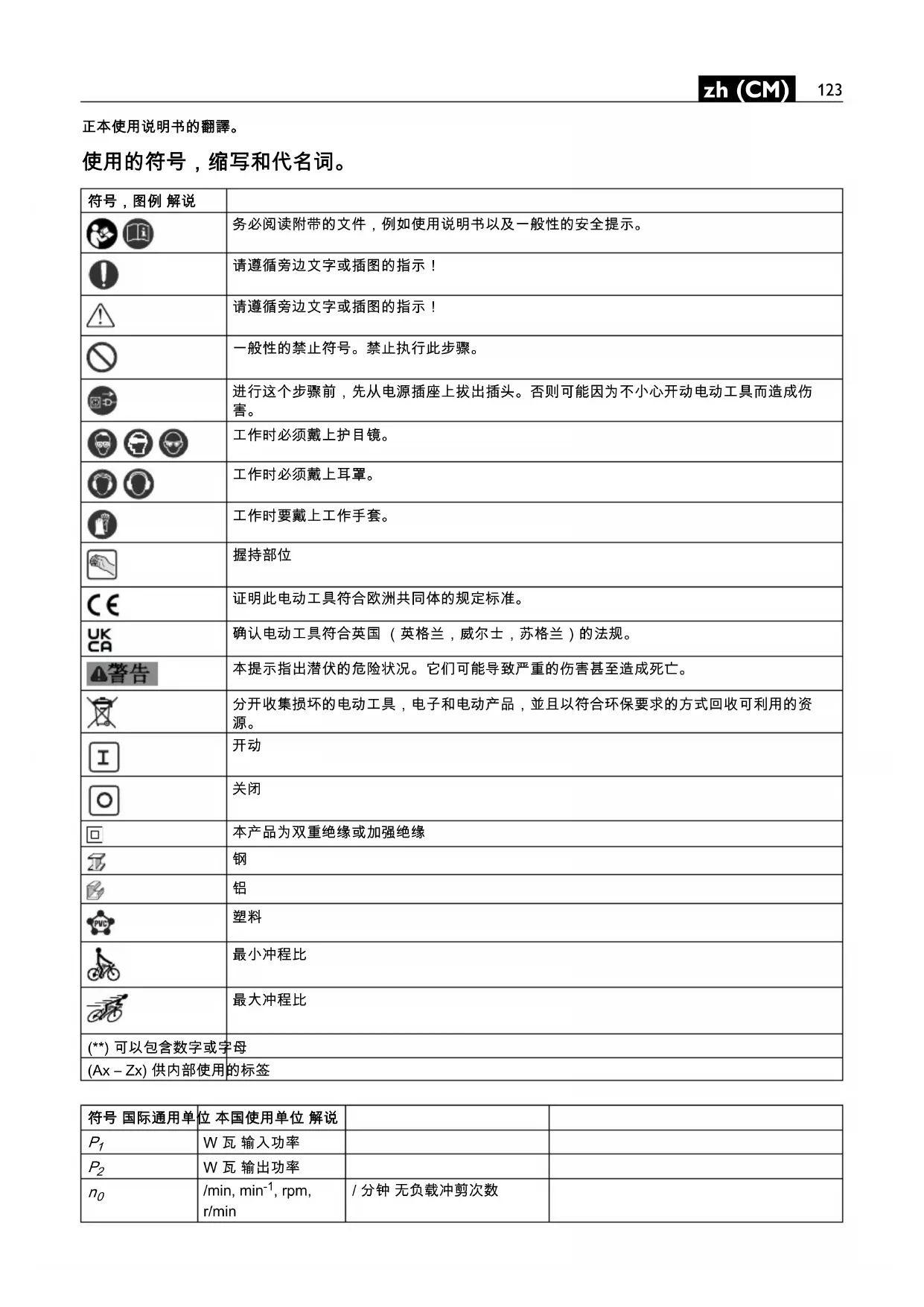 證明此電動工具符合歐洲共同體的規定標準。 確認電動工具符合英國 (英格蘭,威爾士,蘇格蘭)的法規。 本標示提示潛伏的危險狀況。它們可能導致嚴重的傷害甚至造成死亡。 分類收集已損壞的電動工具,電子和電動產品,並且以符合環保要求的方式回收 , 可使有用
