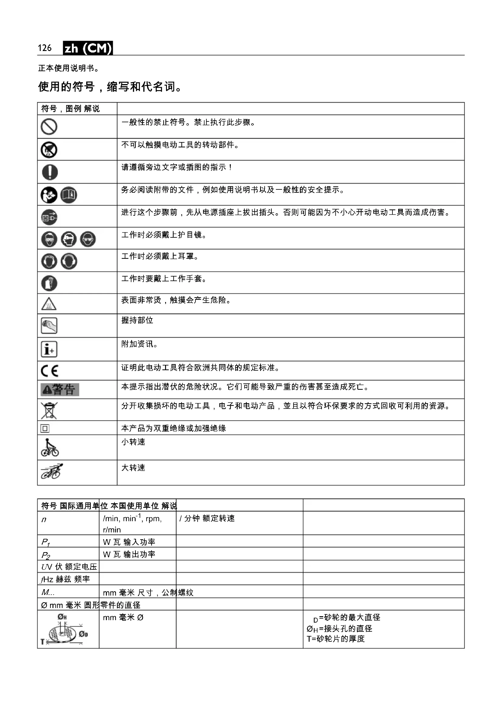 米,秒,公斤,安培,毫米,伏特,瓦,赫兹,牛顿,摄氏,分贝, 分,米/秒 国际性单位系统 SI 中的标准单位和引用单 符号 国际通用单位 本国使用单位 解说 OBJ_BUCH-0000000037-002.book Page 127 Tuesday, February 11, 2014 11:30 AM128 zh (CM) 不要在易燃材料附近操作电动工具。 火星可能会点燃这些