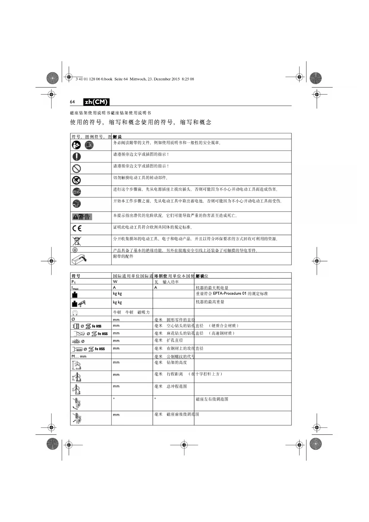 FEIN 指定的工具和附件,即可以在 能够遮蔽风雨的工作场所使用。在本钻架上安装了机器後, 便可以在可磁化的表面使用空心和实心钻头钻孔,以及进行