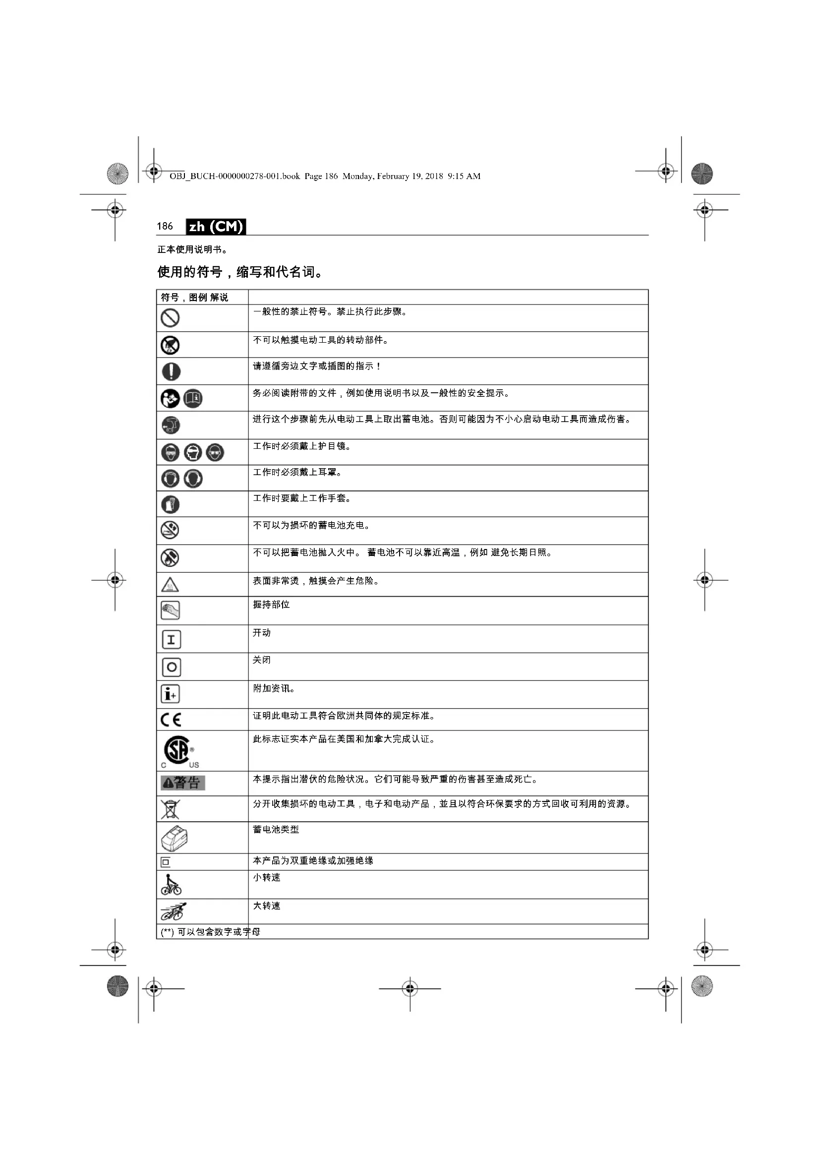 一般性的禁止符号。禁止执行此步骤。 不可以触摸电动工具的转动部件。 请遵循旁边文字或插图的指示! 务必阅读附带的文件,例如使用说明书以及一般性的安全提示。 进行这个步骤前先从电动工具上取出蓄电池。否则可能因为不小心启动电动工具而造成伤害。 工作时必须戴上护目镜。