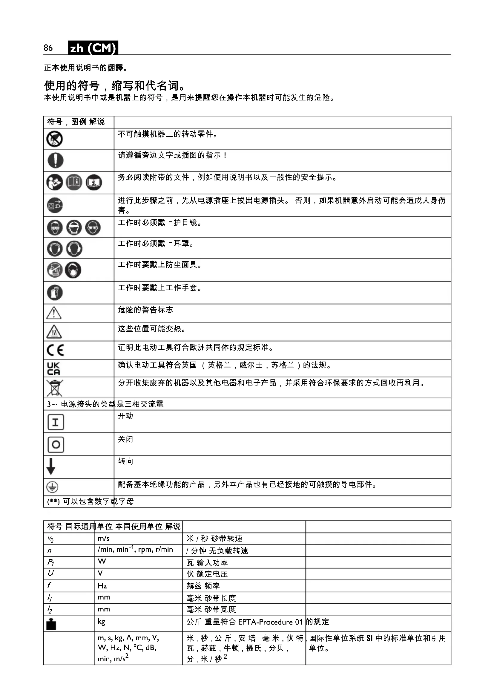 注意机器直立时的稳定性,并确认机器的水平位置。 如 果机器在工作中倾倒了,可能造成严重的伤害。 机器的插头只能由专业电工安装。 电源插座的接地线必 须连接到电源的保护接地装置上 。 维护和修理时,必须拔出电源插头! 如果不小心开动机 器,可能会造成严重的伤害。 请遵循有关法规,定期检查机器电子装备的安全性。 未 定期检查机器,可能有触电的危险。 第一次操作前,先检查发动机的旋转方向。 如果发动机 转向错误,工件可能被机器抛出,并造成意外。发动机 的转向,只能交给专业电工调整。 开动机器后,您本人和其他的人,不可以直接站立在砂 带旁。 砂带可能突然断裂,并造成严重伤害。 处理对身体有危害的废尘 使用本机器时可能会产生有害健康的废尘。 接触或呼吸了某些废尘,例如:石棉尘和有石棉成分的 废尘,含铅的颜料尘,金属尘,某些种类的木尘,矿物 尘,研磨含矿物工件而产生的矽尘,含颜料稀释剂的废 尘,含木材保护剂的废尘以及含防腐蚀剂的废尘等,可 能出现过敏现象和 / 或造成呼吸道疾病,癌症以及影响生 殖能力。吸入废尘后的致病可能性,需视曝露在危尘中 的程度而定。操作机器时必须使用合适而且合格的吸尘 装备,以及佩戴个人的防护装备,另外也要保持工作场 所的良好通风状况。加工含石棉工件的工作必须交给专 业人员执行。木尘和轻建材尘,研磨热尘和化学材料的 混合物,都可能在特定状况下产生自燃或者造成爆炸。 避免让火花喷向集尘箱。防止电动工具和被研磨物过热。 定时清倒集尘箱。注意工件制造商所提出的有关加工时 的注意事项,而且要兼顾贵国有关加工该工件的法规。