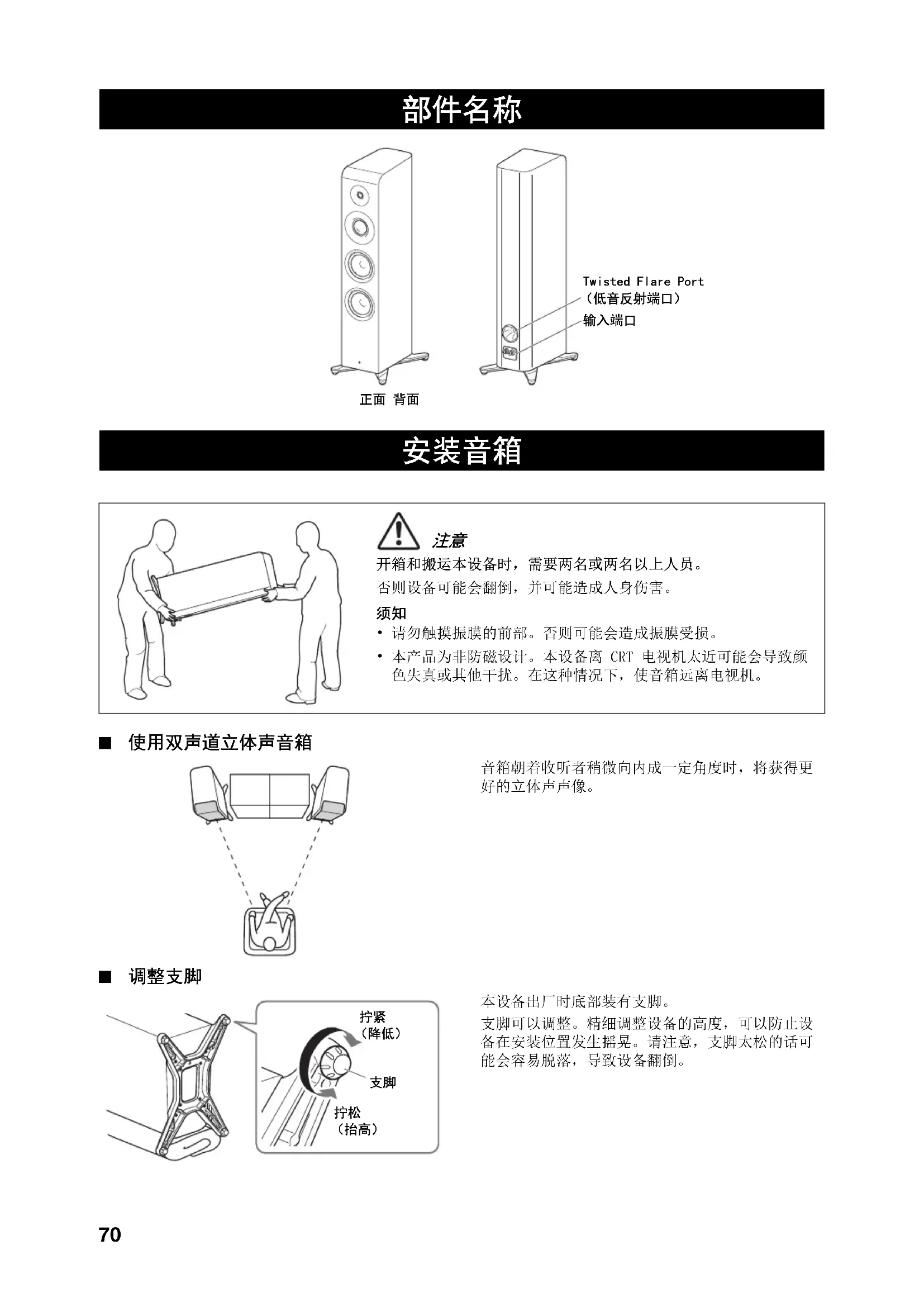 NS-2000A SPL(dB/m) Impedance(ohm)dB/m ohm 脚钉 (4) 网罩 (1)70 ° 使用双声道立体声音箱 音箱朝着收听者稍微向内成一定角度时,将获得更好的立体声声像。 本设备出厂时底部装有支脚。支脚可以调整。精细调整设备的高度,可以防止设备在安装位置发生摇晃。请注意,支脚太松的话可能会容易脱落,导致设备翻倒。