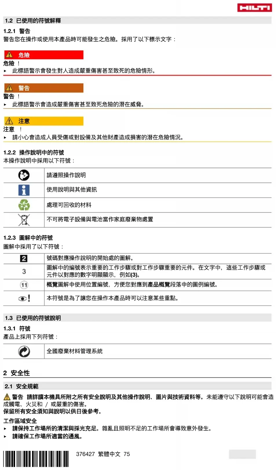 有受傷的危險 化學物質危險。 ▶ 若裝有錫箔藥劑包的錫箔藥劑包套筒受到嚴重撞擊或掉落,則必須檢查錫箔藥劑包套筒與錫箔藥劑包是否 有損壞,必要時予以更換。 使用前,請詳閱錫箔藥劑包標籤上的安全說明及使用條件並確認植筋劑的使用期限。 除非錫箔藥劑包有正確裝在錫箔藥劑包套筒中,否則請不要嘗試將植筋劑擠出來。 本機具是專門設計搭配容量1400 ml之Hilti錫箔藥劑包使用。