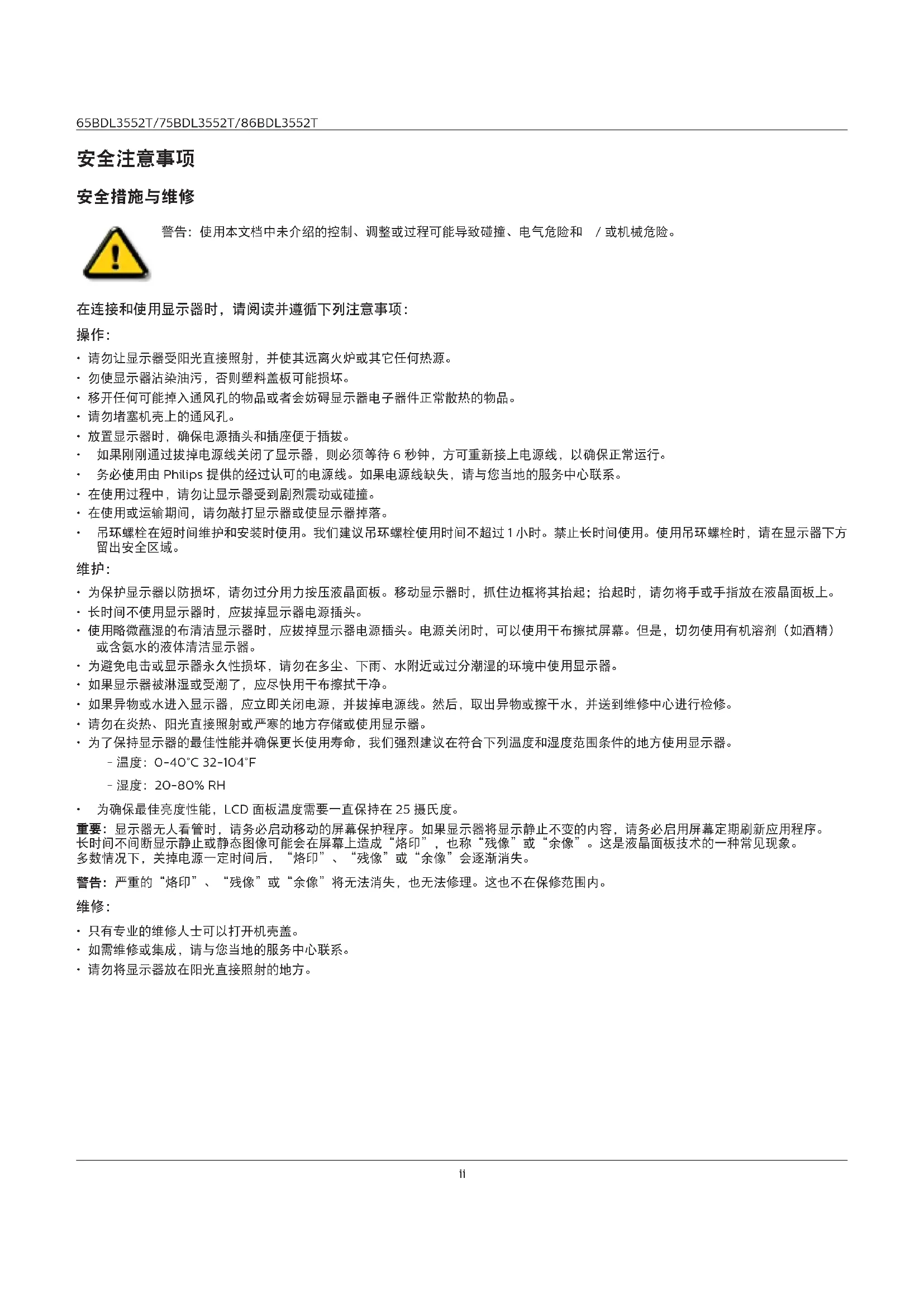- 请勿将显示器放在阳光直接照射的地方。65BDL3552T/75BDL3552T/86BDL3552T iii 如果您按照本文档所述进行操作但显示器工作不正常,请联系技术人员或您当地的服务中心。