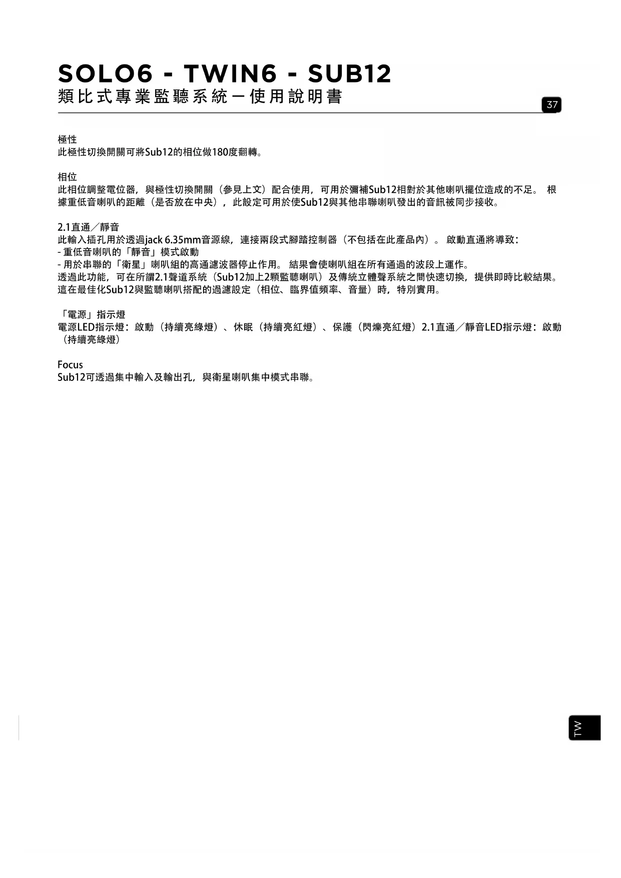 此相位調整電位器,與極性切換開關(參見上文)配合使用,可用於彌補Sub12相對於其他喇叭擺位造成的不足。 根 據重低音喇叭的距離(是否放在中央),此設定可用於使Sub12與其他串聯喇叭發出的音訊被同步接收。 2.1直通/靜音 此輸入插孔用於透過jack 6.35mm音源線,連接兩段式腳踏控制器(不包括在此產品內)。 啟動直通將導致: - 重低音喇叭的「靜音」模式啟動 - 用於串聯的「衛星」喇叭組的高通濾波器停止作用。 結果會使喇叭組在所有通過的波段上運作。 透過此功能,可在所謂2.1聲道系統(Sub12加上2顆監聽喇叭)及傳統立體聲系統之間快速切換,提供即時比較結果。 這在最佳化Sub12與監聽喇叭搭配的過濾設定(相位、臨界值頻率、音量)時,特別實用。