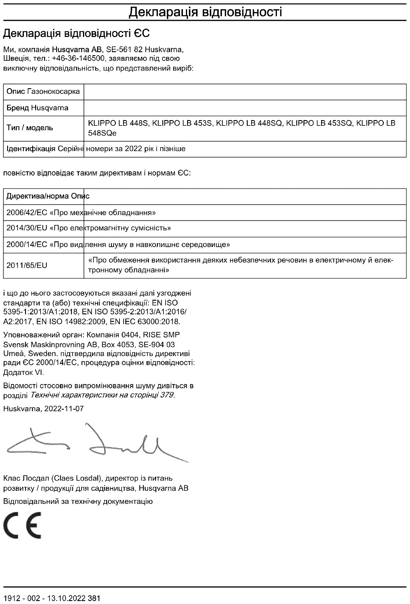 KLIPPO LB 448S, KLIPPO LB 453S, KLIPPO LB 448SQ, KLIPPO LB 453SQ, KLIPPO LB 548SQe 标识 2022 及以后的序列号 完全符合以下欧盟指令和法规的要求:
