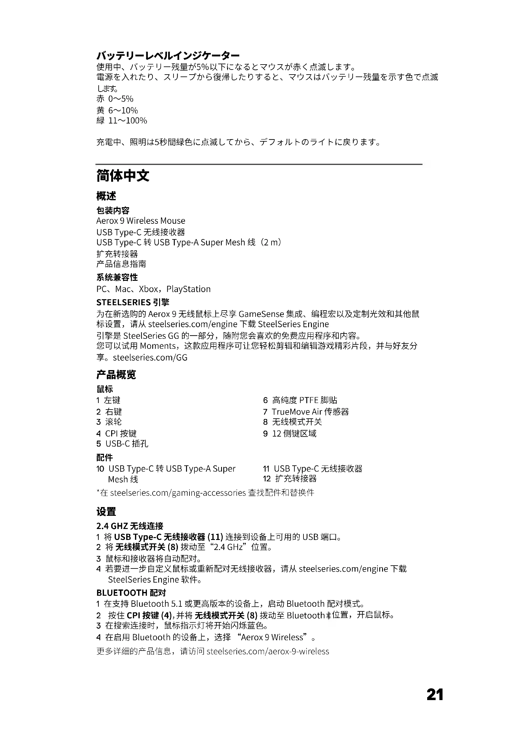 1 將 USB Type-C 無線接收器 (11) 連接到設備上可用的 USB 埠。 2 將 無線模式開關 (8) 撥動至“2.4 GHz”位置。 3 滑鼠和接收器將自動配對。 4 若要進一步自訂滑鼠或重新配對無線接收器,請從 steelseries.com/engine 下載 SteelSeries Engine 軟體。 BLUETOOTH 配對 1 在支援 Bluetooth 5.1 或更高版本的設備上,啟動 Bluetooth 配對模式。23 2 按住 CPI 按鍵 (4),並將 無線模式開關 (8) 撥動至 Bluetooth 位置,開啟滑鼠。 3 在搜尋連接時,滑鼠指示燈將開始閃爍藍色。 4 在啟用 Bluetooth 的設備上,選擇 “Aerox 9 Wireless”。 更多詳細的產品資訊,請訪問 steelseries.com/aerox-9-wireless