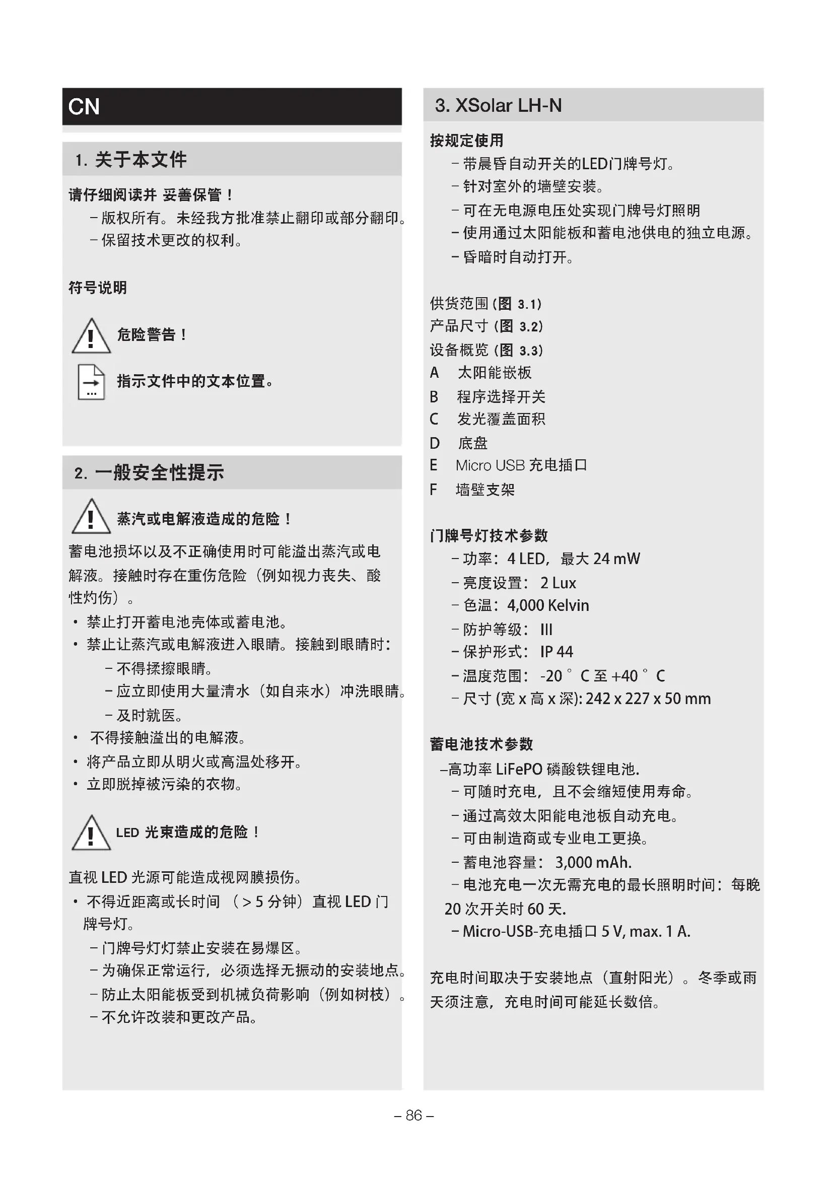 – 高功率LiFePO磷酸铁锂电池. –可随时充电,且不会缩短使用寿命。 –通过高效太阳能电池板自动充电。 –可由制造商或专业电工更换。 –蓄电池容量:3,000mAh. –电池充电一次无需充电的最长照明时间:每晚 20次开关时60天. –Micro-USB-充电插口5V,max.1A. 充电时间取决于安装地点(直射阳光)。冬季或雨 天须注意,充电时间可能延长数倍。– 87 – 4.安装